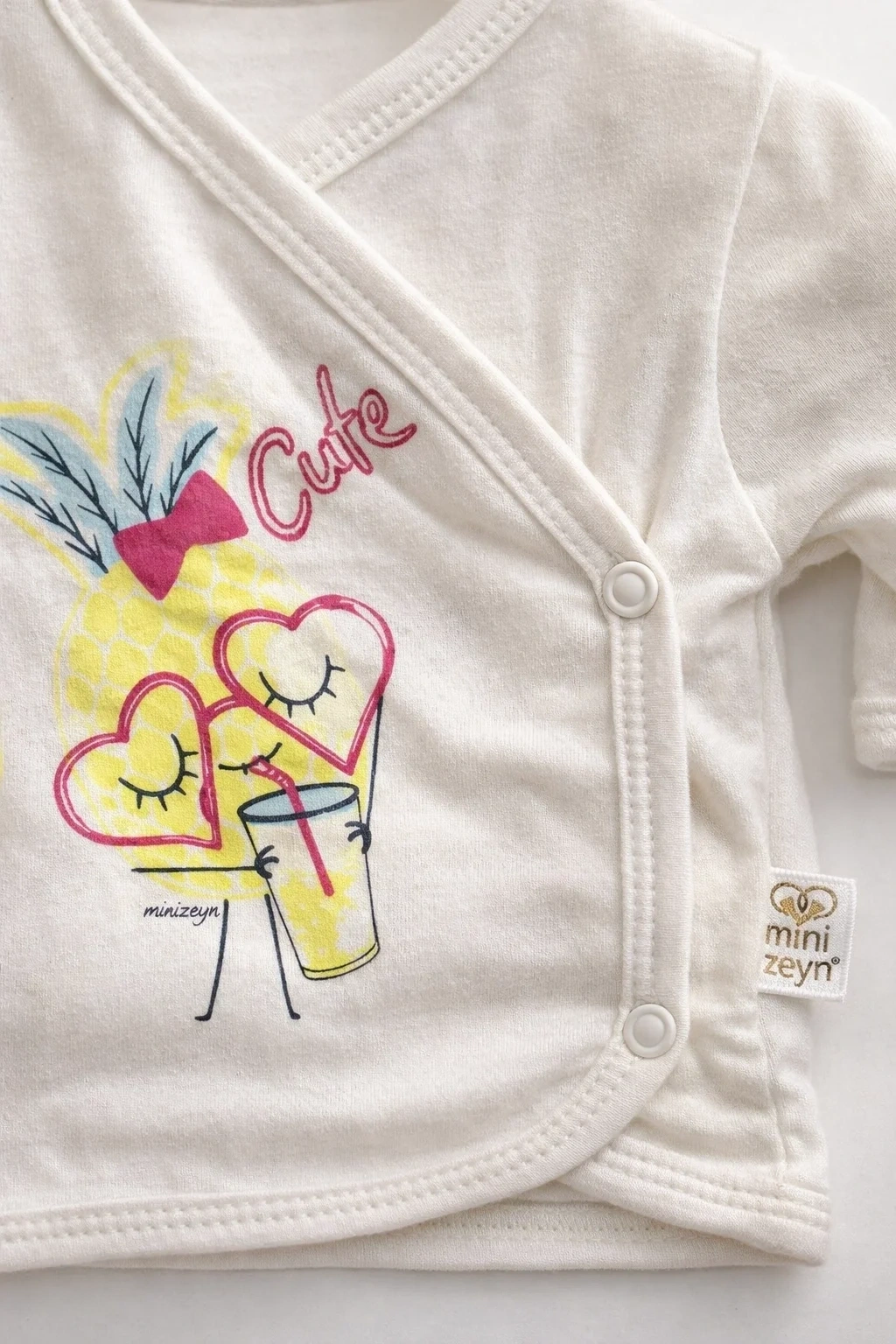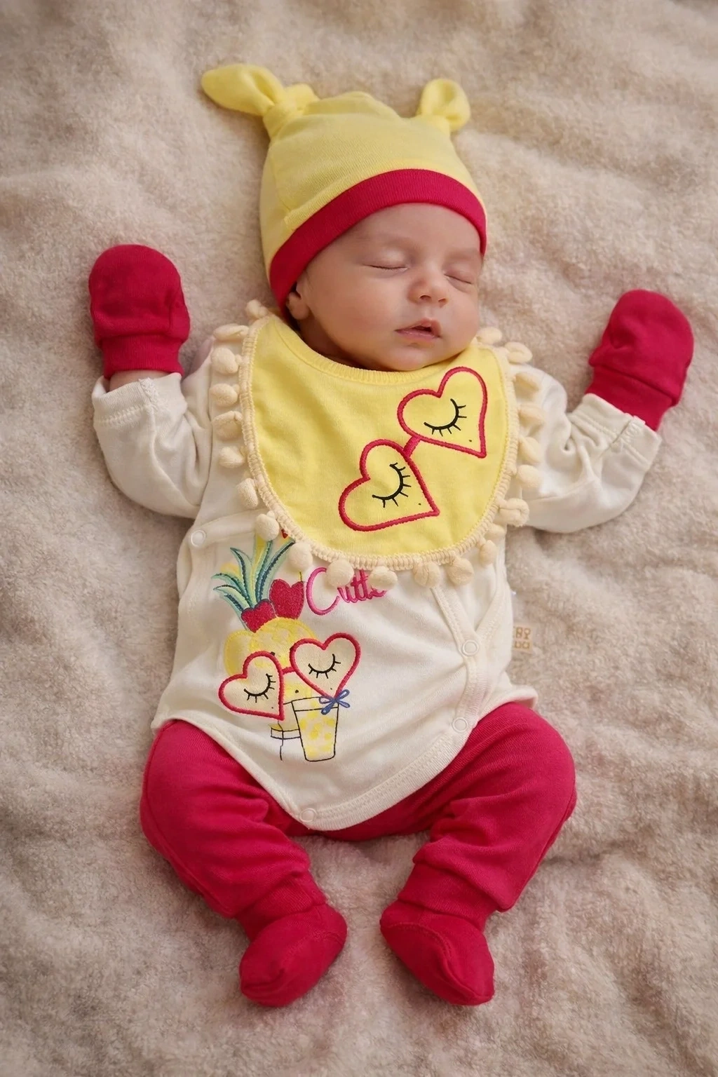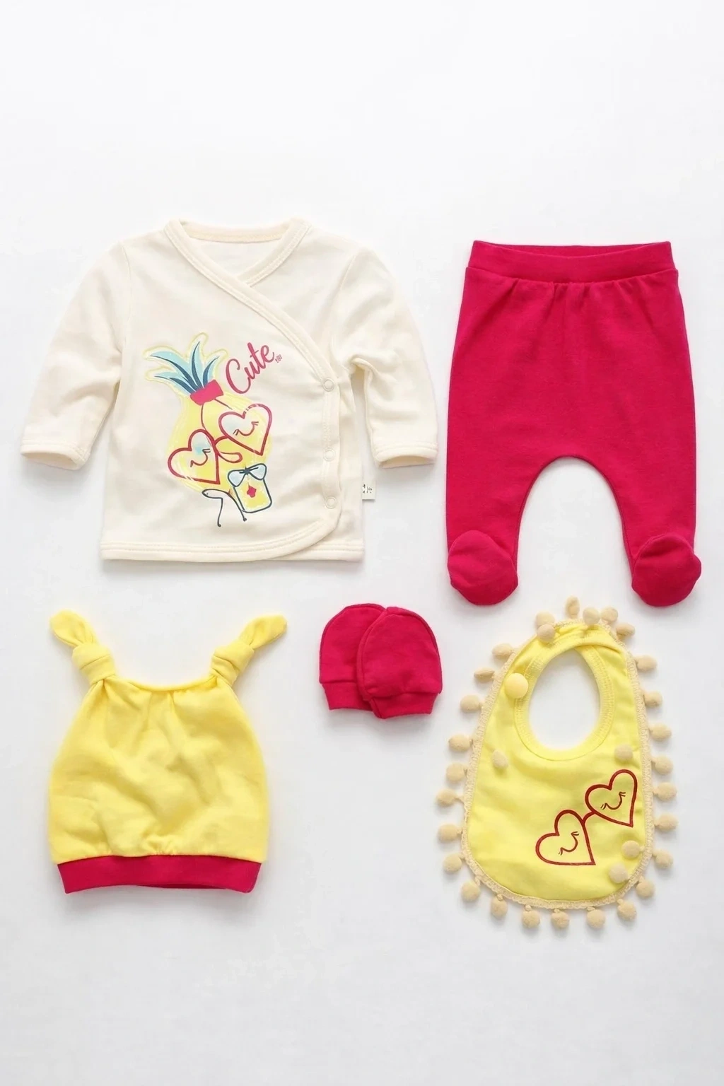 Sevimli Ananaslı Kalpli desenleriyle yenidoğan bebeğinizin hastane çıkışını şık ve konforlu hale getirin! %100 pamuklu, yumuşacık 5 parça hastane çıkış seti. Unisex kullanım için ideal, 0-3 ay bebeklere özel tasarlandı. Bebeğinizin hassas cildine nazik dokunuş!