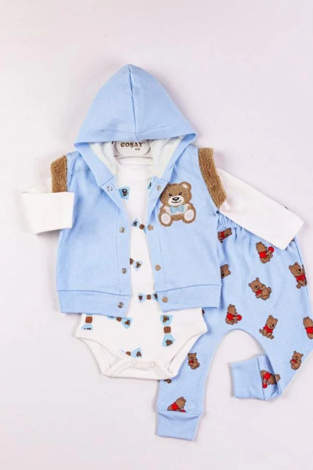 Bear Nakışlı Yelekli 3'lü Erkek Bebek Takımı