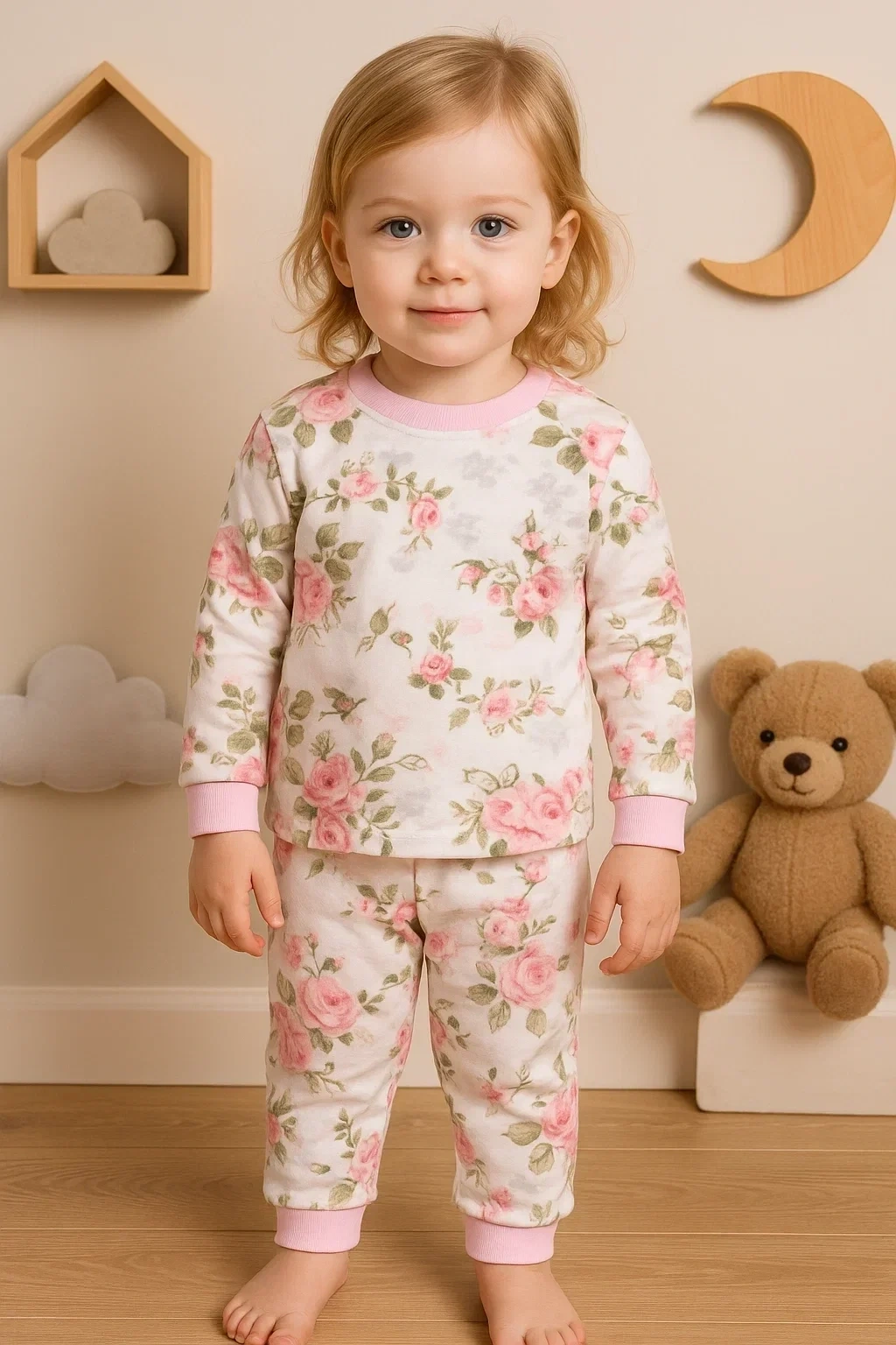 • Büyük Çiçek Desenli Kız Bebek Eşofman Takımı %100 Pamuk