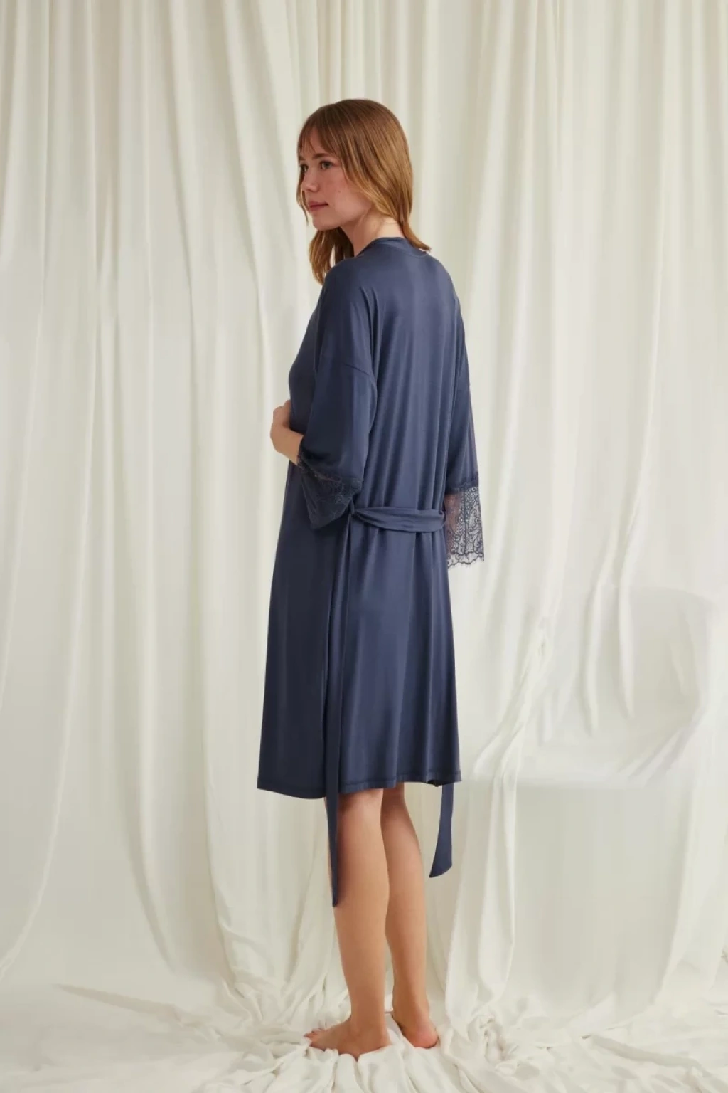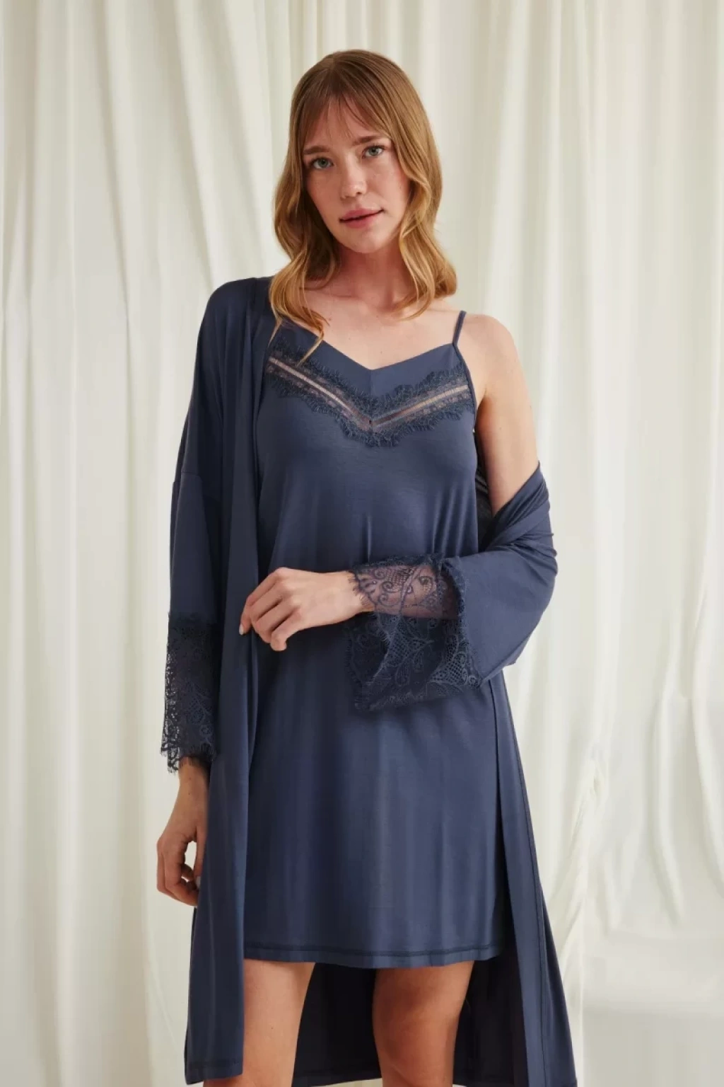 Gecelik: Lacivert renklidir, ayarlanabilir ip askılıdır, derin V yaka dekoltelidir, göğüs kısmı dantellidir, örme kumaştır.