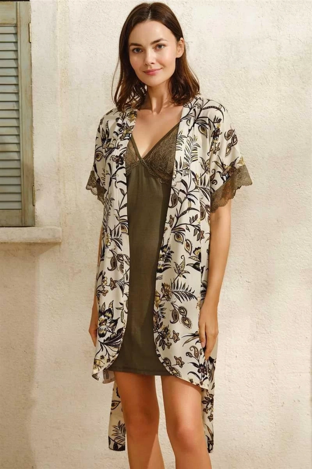 Zarif ve romantik tasarımıyla öne çıkan bu iki parçalı takım, ev giyimine hem şıklık hem de konfor katar. Dokuma viskon sabahlık hafif ve akıcı yapısıyla rahat bir kullanım sağlarken, çiçek baskısı tasarıma enerjik ve feminen bir dokunuş katar. İnce dantel detaylı kısa gecelik, romantik ve çekici bir görünüm sunar. Takım, özel anlarda veya evde şık ve rahat bir stil arayanlar için ideal bir tercihtir.