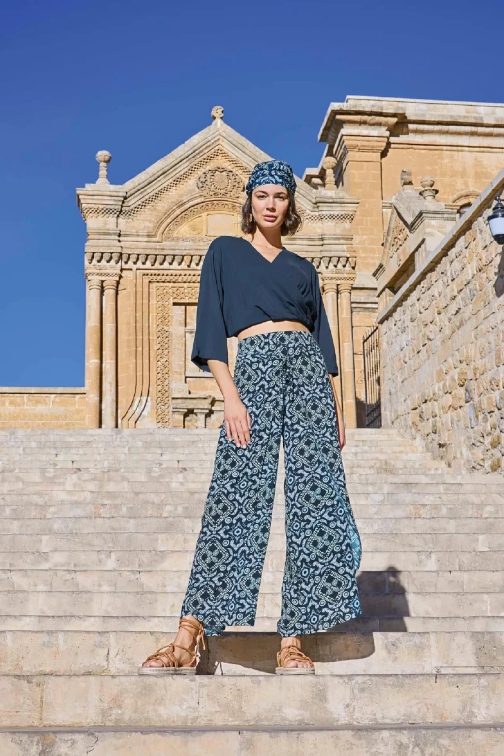 Üst: Lacivert renklidir, V yakalıdır, kısa kolludur, dokuma kumaştır.