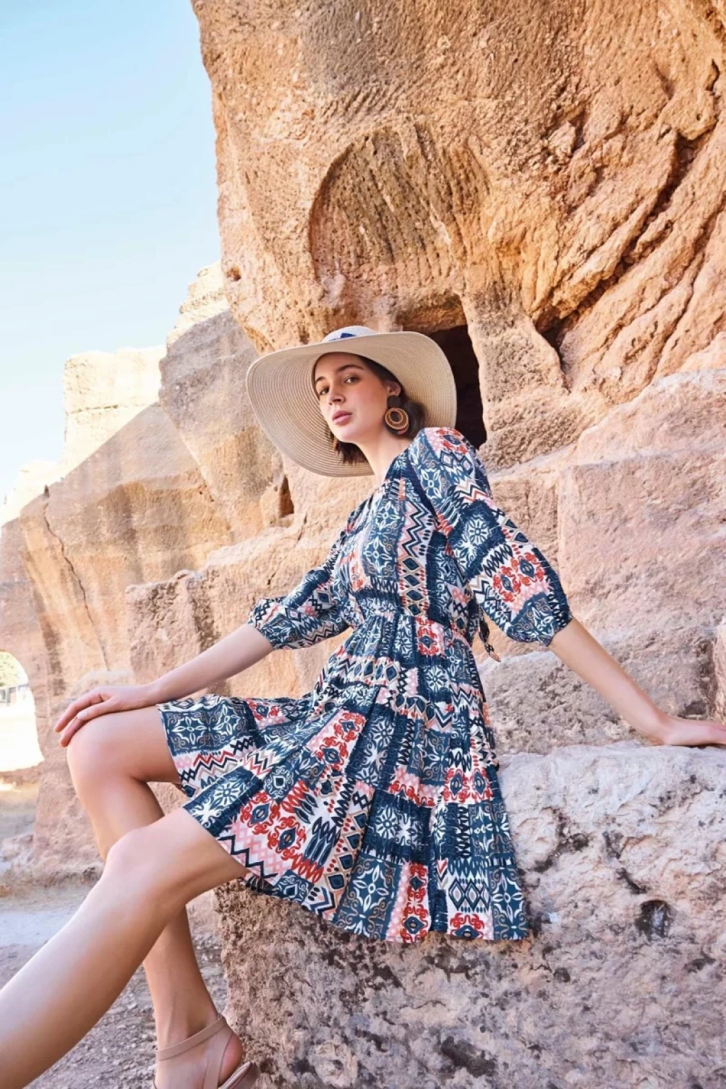 Elbise: Etnik desenlidir, V yakalıdır, truvakar kolludur, dokuma kumaştır.