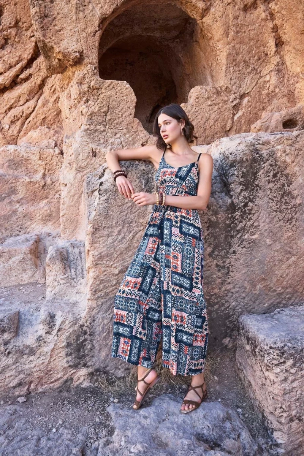 Elbise: Etnik desenlidir, derin V yakalıdır, ip askılıdır, önden bağcıklı püskül detaylıdır, beli lastiklidir, dokuma kumaştır.