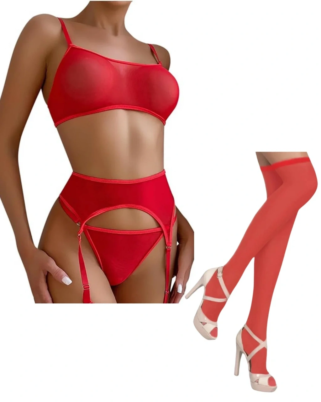 Fantezi Kırmızı Transparan Tül Jartiyer Takımı