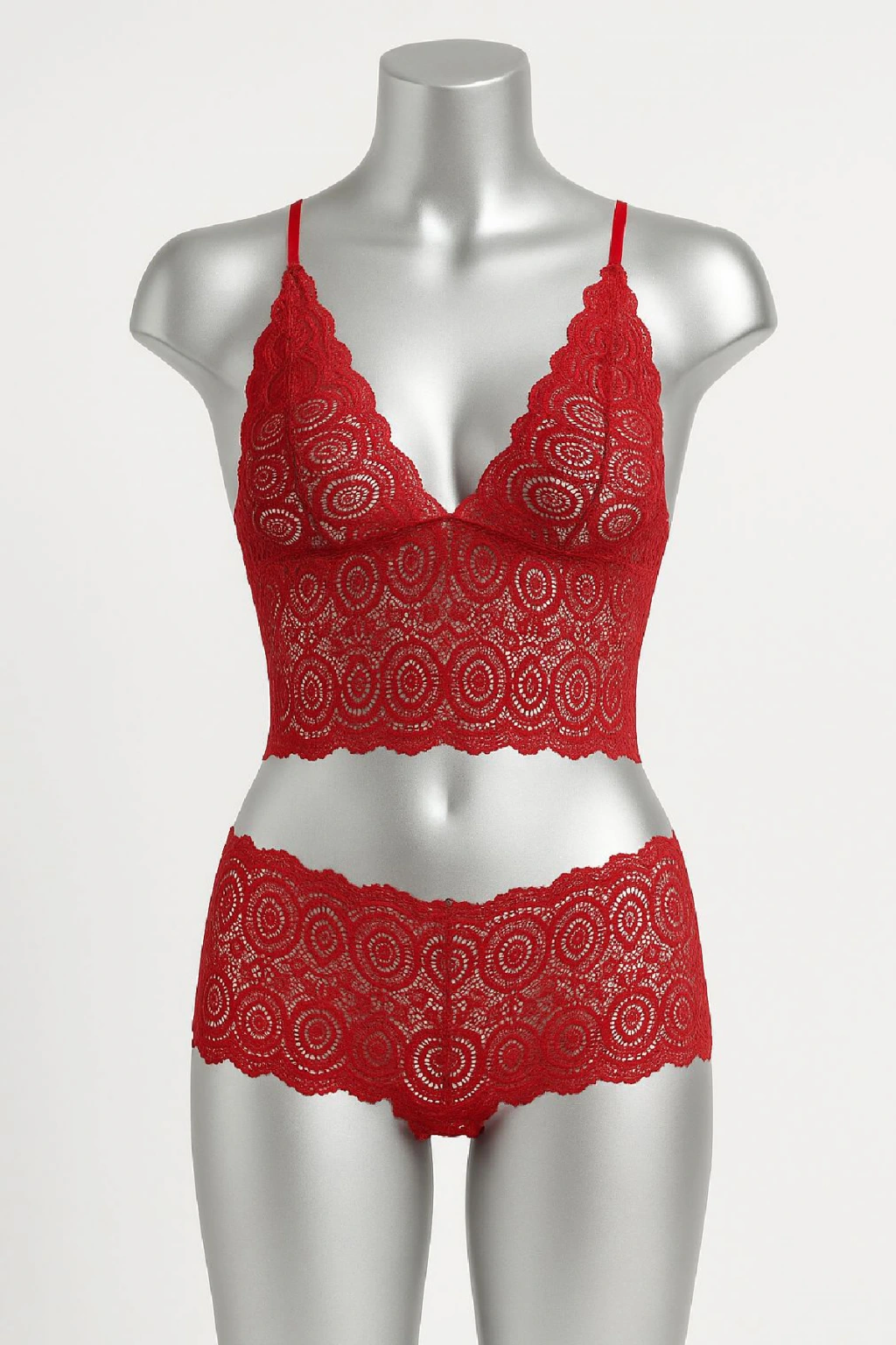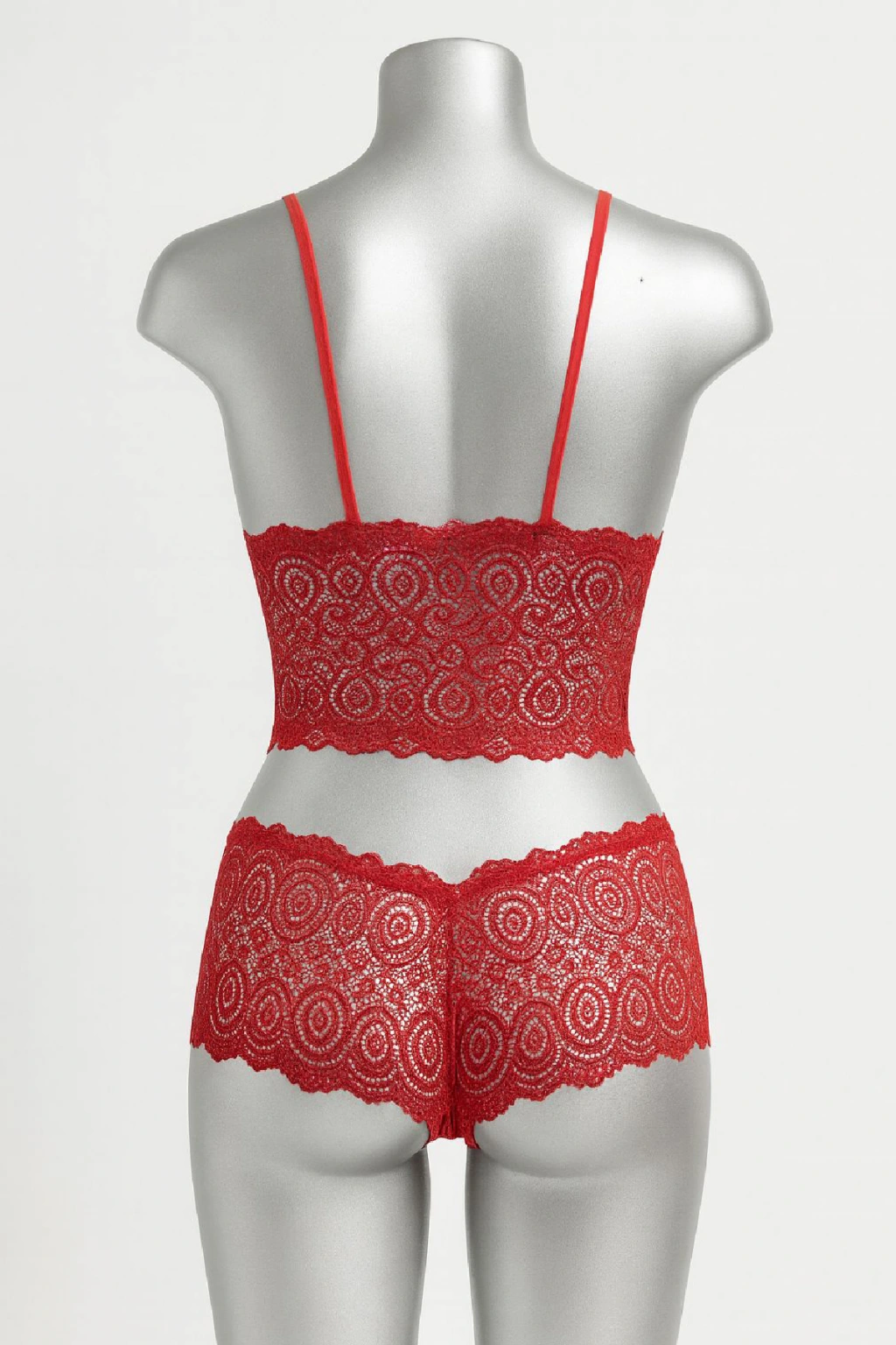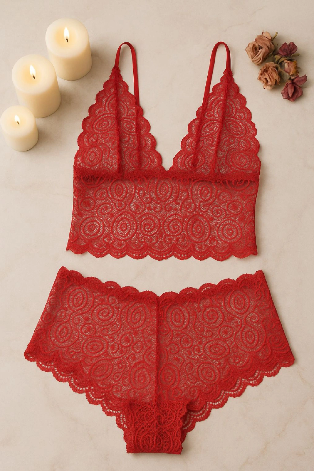 • Tutkunun simgesi olan kırmızı dantel bralet şort takımı, cesur ve feminen bir görünüm isteyenler için özel olarak tasarlandı.