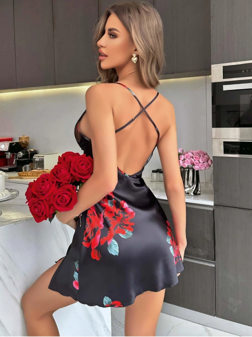 • Kadın Siyah Saten Askılı Dantel Detaylı Gül Çicek Baskılı Gecelik 2221