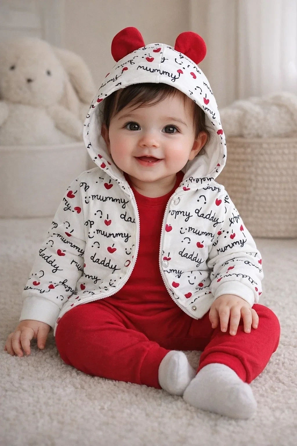 Sevimli tasarımıyla öne çıkan Kalp Desenli Kulaklı Bebek Sweat Takımı, miniklerin hem rahat hem de şık görünmesini sağlar. Kapüşon üzerindeki kulak detayları ve kalp desenleri ürüne tatlı bir hava katarken, yumuşak dokulu kumaşı bebeğinizin hassas cildine uyum sağlar.
