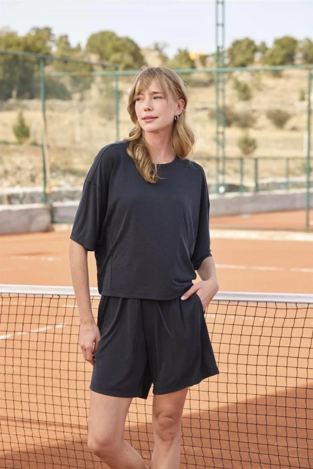 Üst: Antrasit renklidir, bisiklet yakalıdır, kısa kolludur, örme kumaştır.