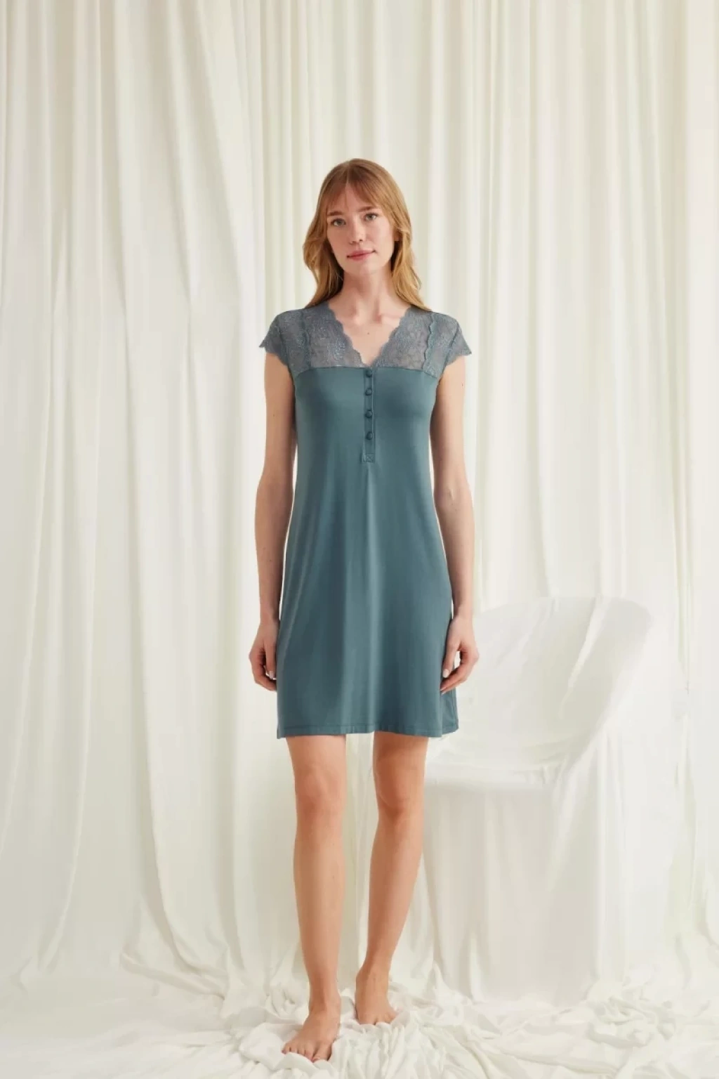 Gecelik: Yeşil renklidir, V yakalıdır, kolu, omzu ve yakası dantellidir, yakasının altı düğmelidir, kısa kolludur, örme kumaştır.