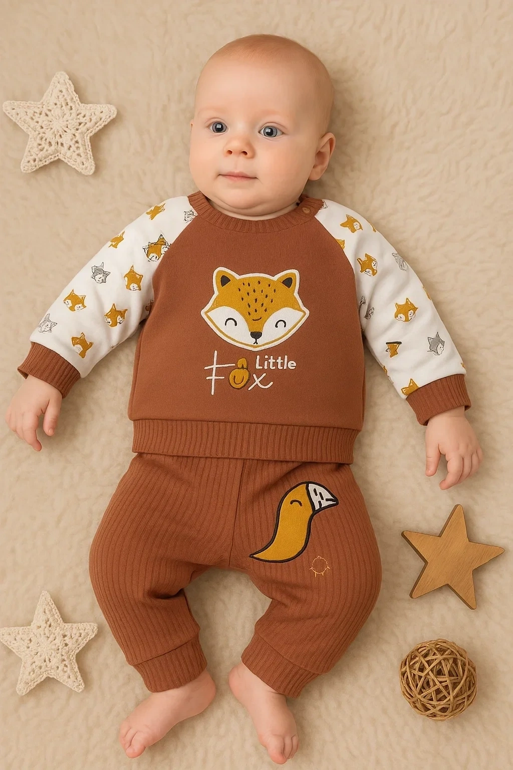 Littie Fox Nakışlı % 100 Pamuk Hırkalı 2'li Erkek Takım