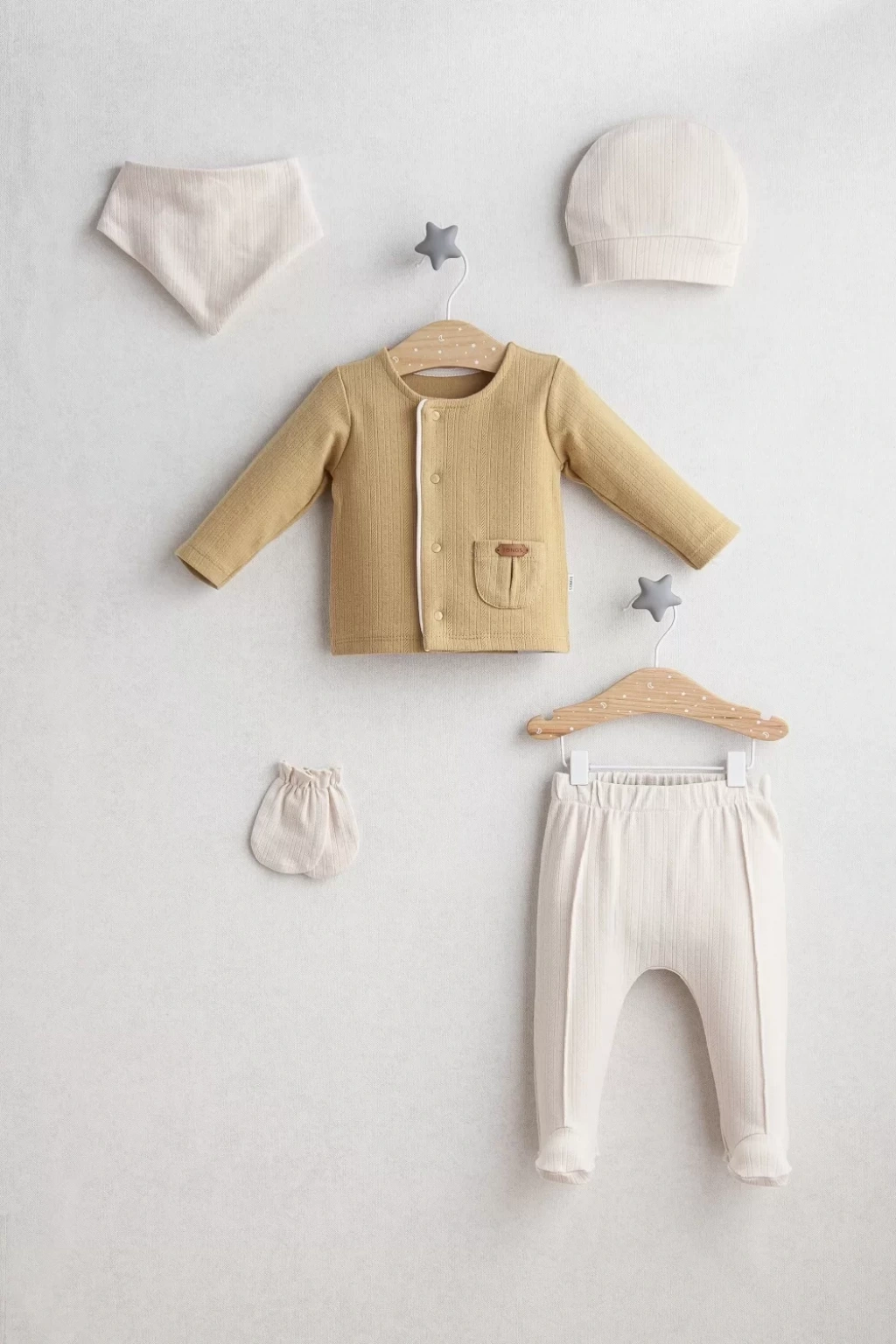 Little Bear temalı bu 5'li zıbın takım, ekru ve hardal rengin zarifliği ile tasarlanmıştır ve %100 pamuk dokusuyla bebeklerin hassas ciltlerine uyum sağlar.