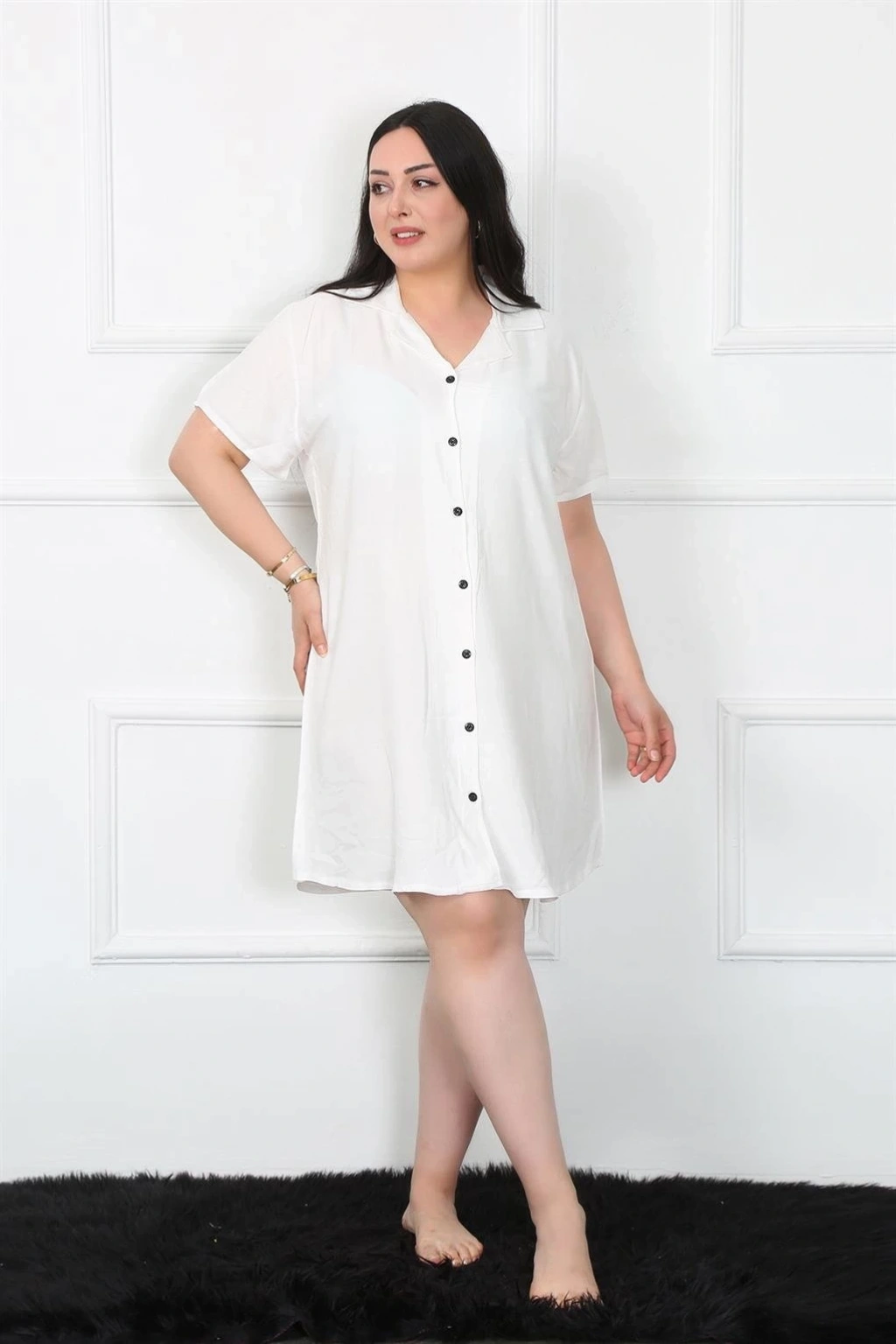 Çamaşır Kenti Büyük Beden Dokuma Düğmeli Beyaz Tunik Gecelik