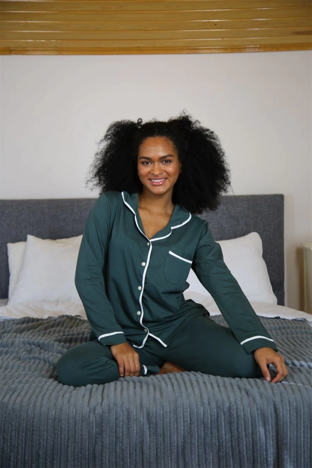 Kadın %100 pamuk penye önden düğmeli uzun kol pijama takım yeşil, Çamaşır Kenti kalitesiyle gecelerinizi şenlendirecek.