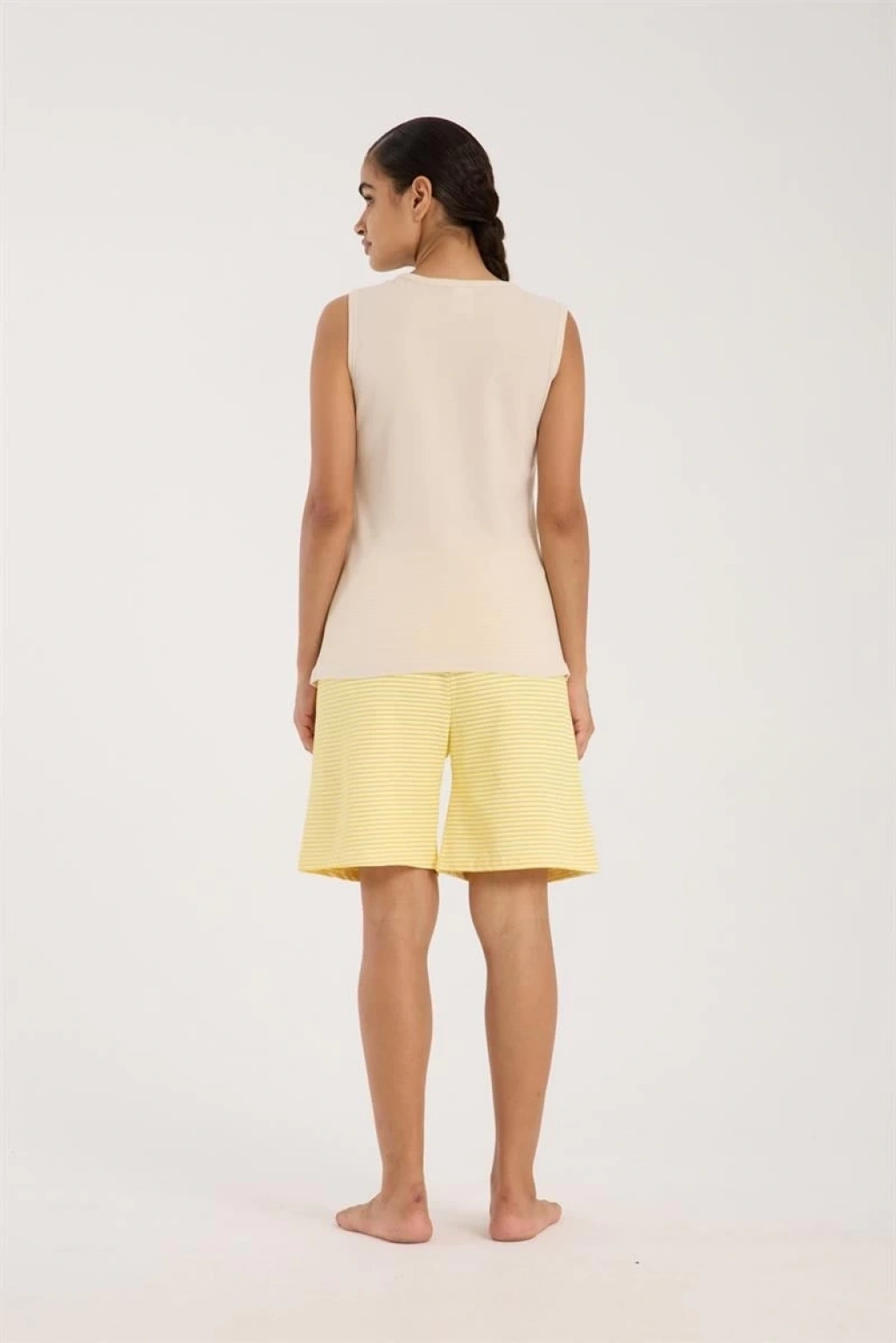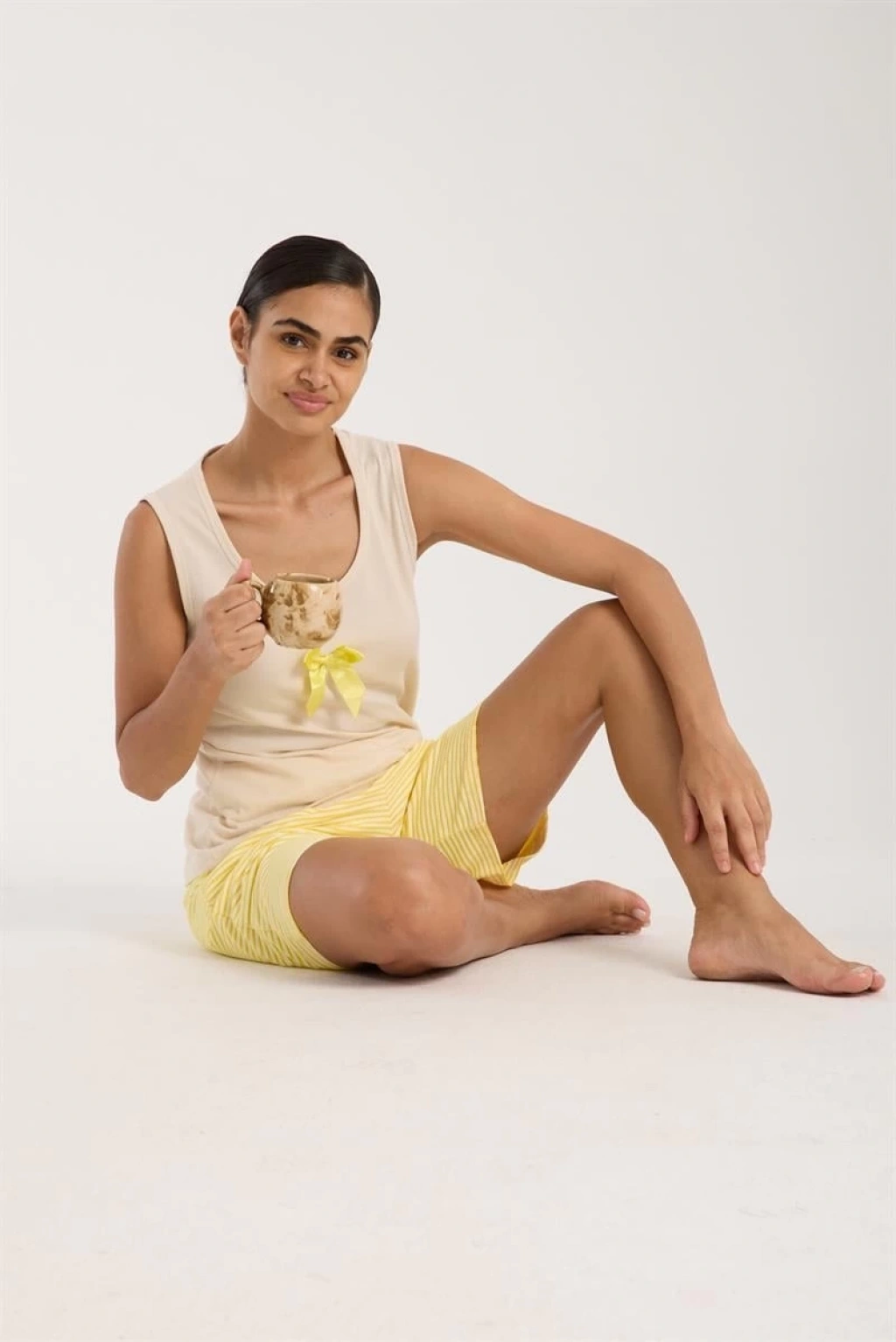 şıklık ve konforu bir arada sunan Kadın Beyaz Kurdele Detaylı Sarı Çizgili Şortlu Pijama Takımı, rahat bir gece geçirmeniz için tasarlandı.