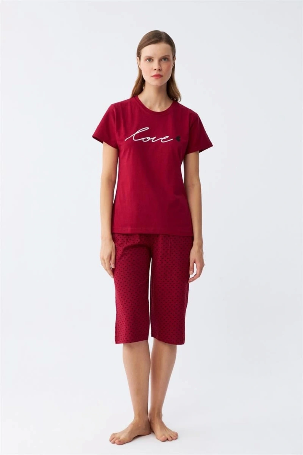 Kadın Bordo Kalp Desenli Kapri Pijama Takımı, hem şıklığı hem de konforu bir arada arayan kadınların tercihi olacak!