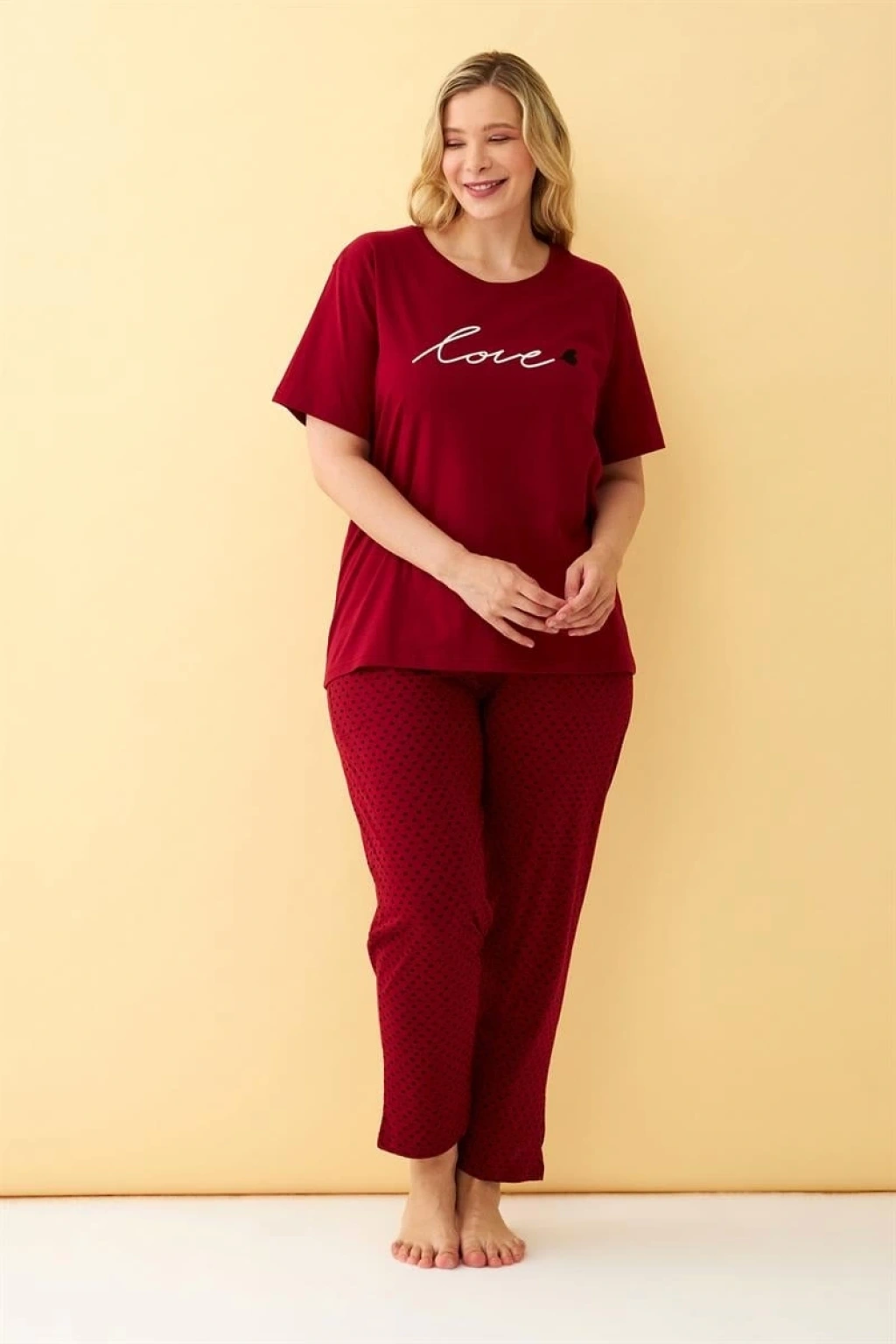 Çamaşır Kenti markasının büyük beden pijama takımları arasında yer alan bu şık bordo renkli pijama takımı, şıklığı ve rahatlığı bir arada sunuyor. Aynı zamanda üzerinde yer alan "Love" yazısıyla da sevdiklerinize hediye olarak da düşünebileceğiniz bir seçenek.