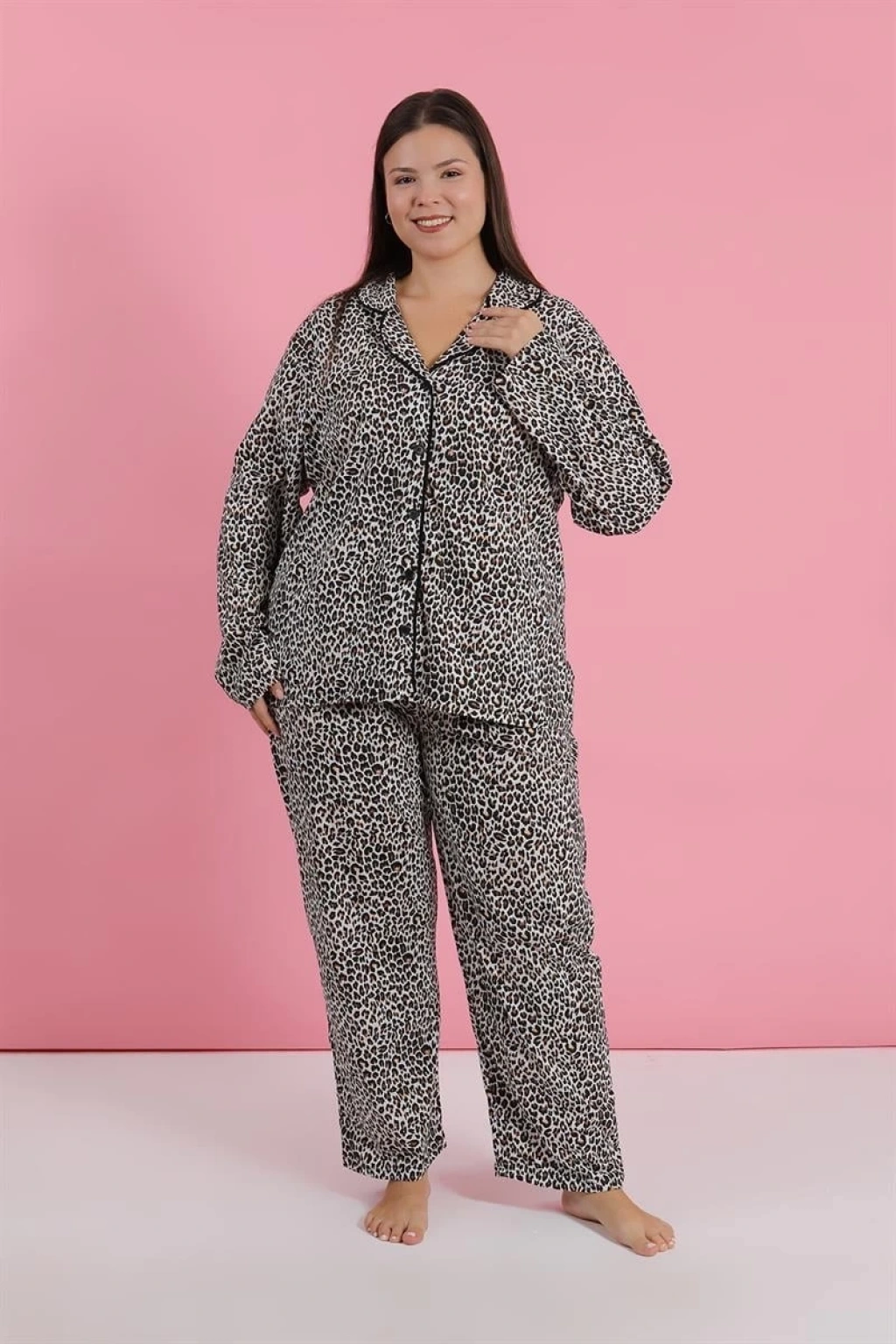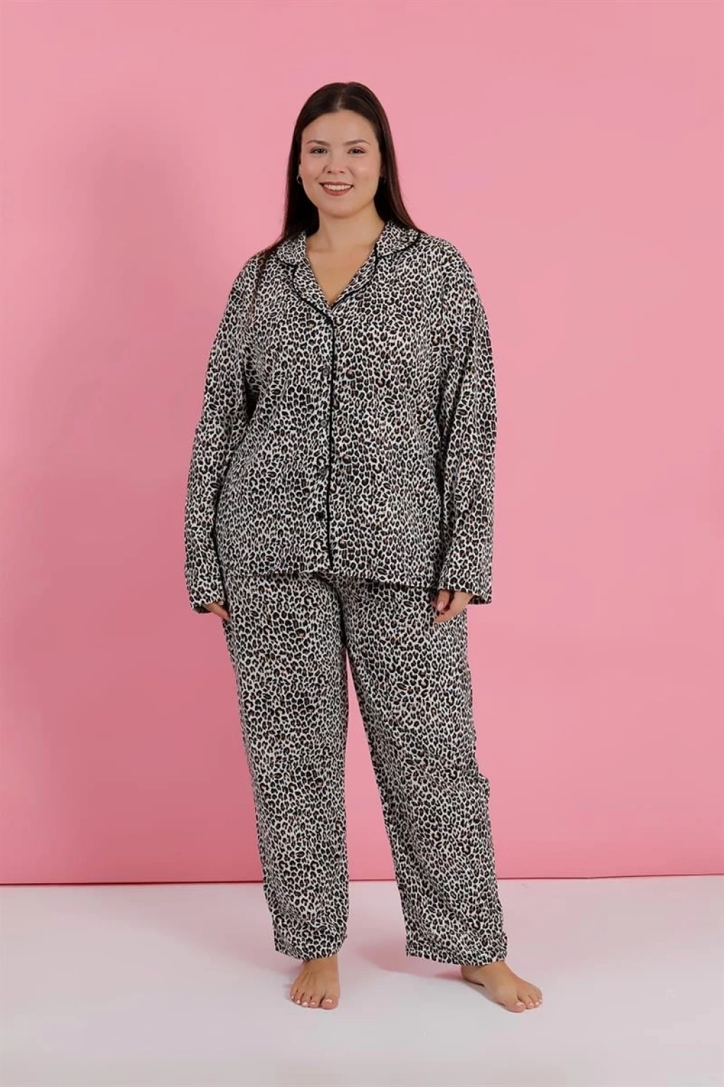 Çamaşır Kenti Kadın Büyük Beden Leopar Desenli Düğmeli Pijama Takımı, rahatlığı ve şıklığı bir arada sunar.