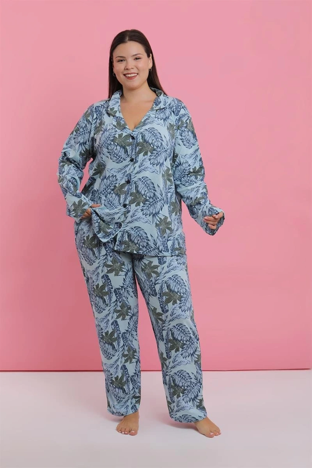 Bu yazın serin gecelerinde rahatlığın ve şıklığın keyfini çıkarın! Çamaşır Kenti'nin mavi tropikal desenli düğmeli pijama takımı, büyük beden kadınlar için özel olarak tasarlanmıştır.