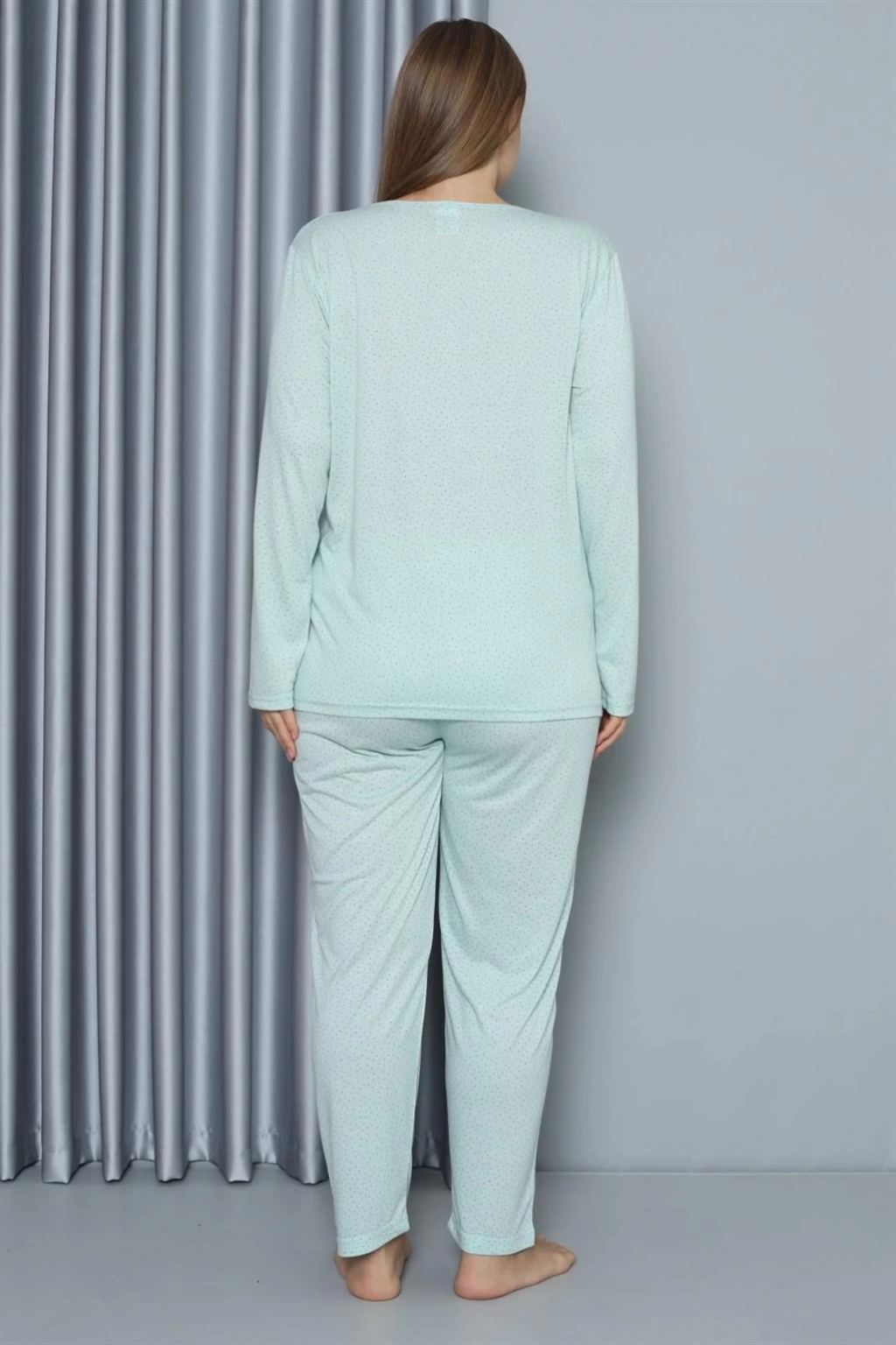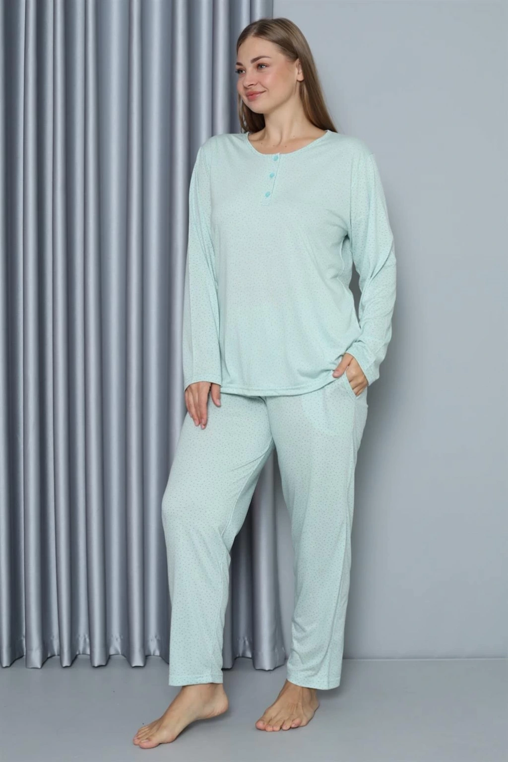 Çamaşır Kenti markasının şık ve konforlu büyük beden penye uzun kol pijama takımı, artık gardırobunuzun vazgeçilmezi olmaya aday! Su yeşili rengi ile dikkat çeken bu pijama takımı, hem şıklığı hem de rahatlığı bir arada sunuyor.
