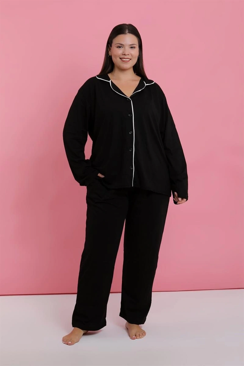 Çamaşır Kenti markasının şık ve konforlu bir seçimi olan Kadın Büyük Beden Siyah Düğmeli Pijama Takımı, büyük beden kullanıcılar için özel olarak tasarlanmıştır.