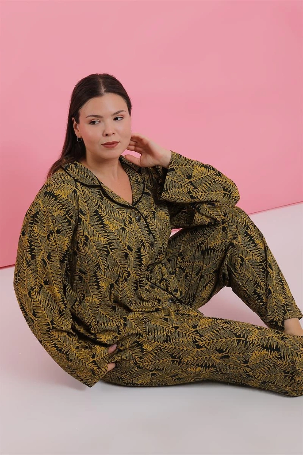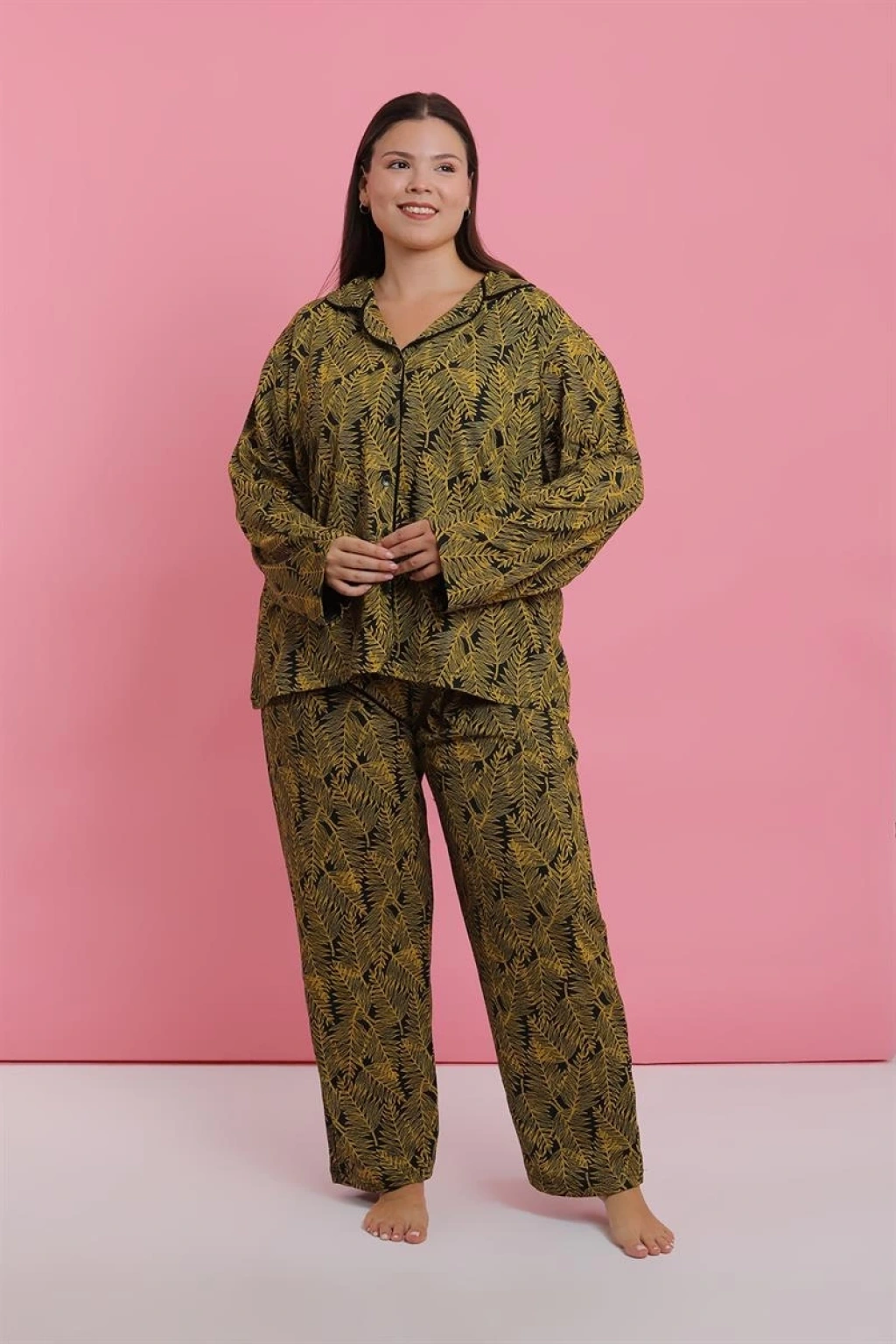 Çamaşır Kenti büyük beden tropikal yaprak desenli düğmeli pijama takımı, şıklığı ve konforu bir arada arayan kadınların tercihi olmaya adaydır.