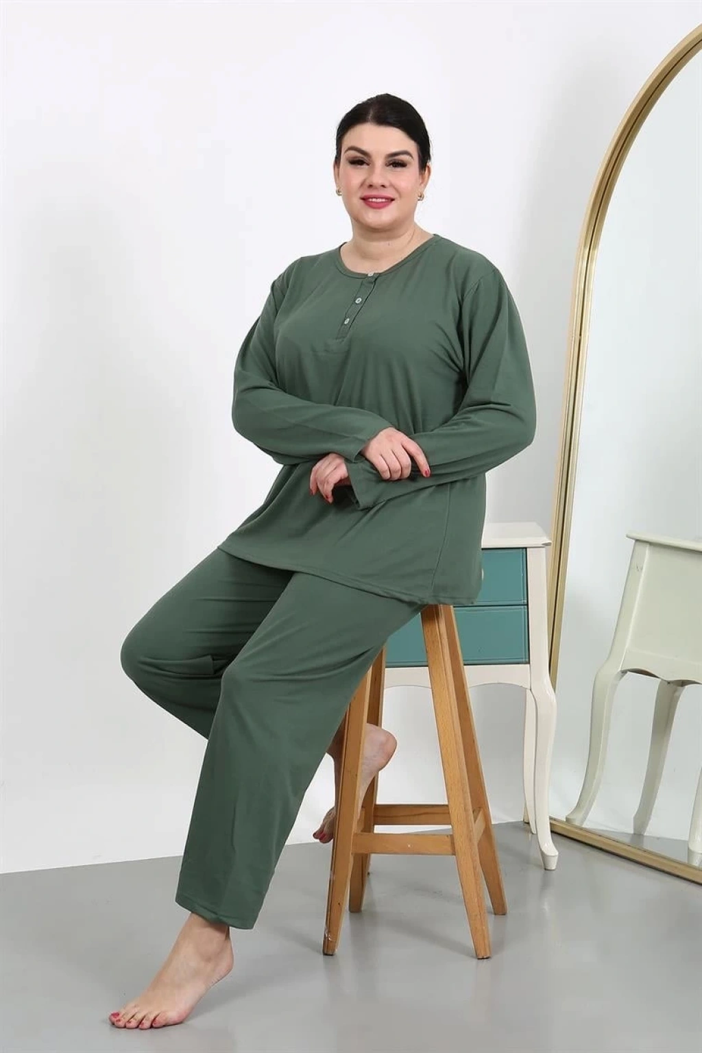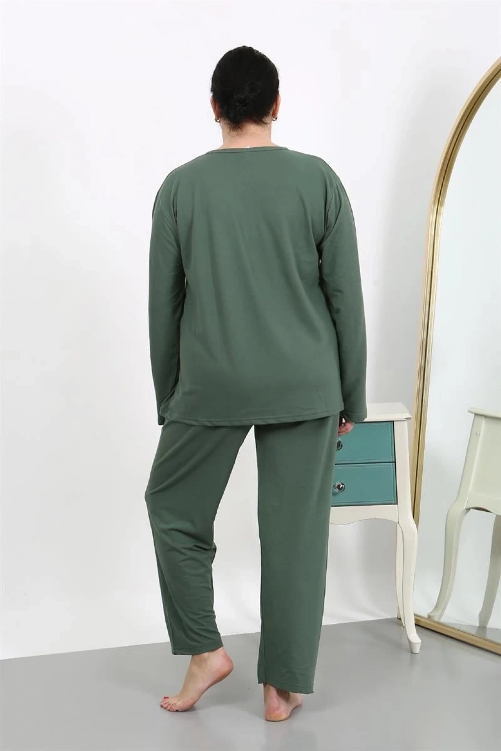 Moda Kadın Büyük Beden Uzun Kol Penye Pijama Takımı Haki