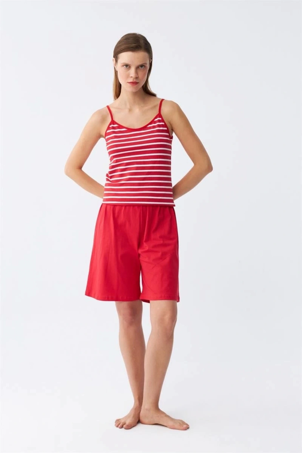 Çamaşır Kenti markası tarafından özenle tasarlanan Kadın İp Askılı Pamuk Penye Şortlu Takım Kırmızı, yaz aylarında şıklık ve konfor arayan kadınların favorisi olmaya aday.