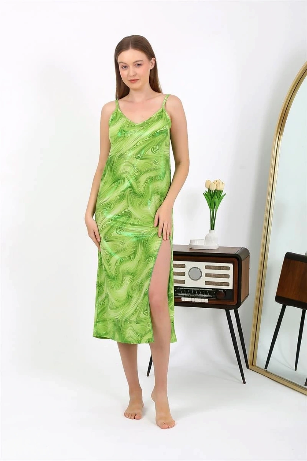Çamaşır Kenti markasının şık ve şehvetli tasarımıyla karşınızda: Kadın İp Askılı Uzun Parlak Micro Elbise Gecelik Yeşil!