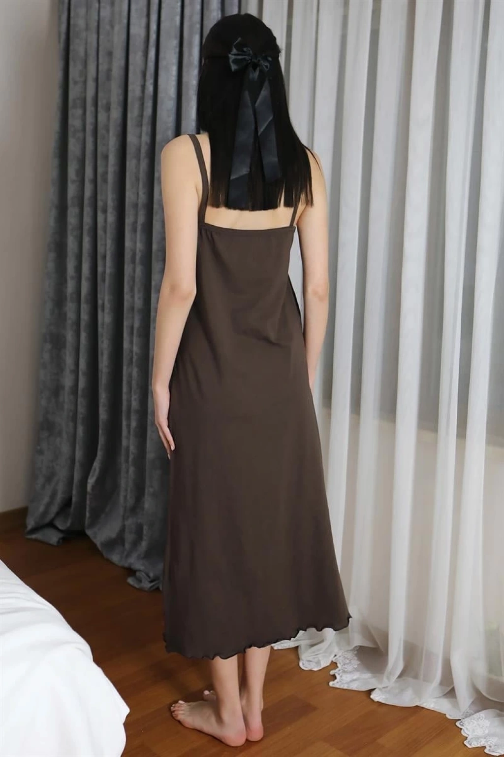 Çamaşır Kenti'nin tasarladığı Kadın İp Askılı Uzun Yırtmaçlı Pamuk Penye Gecelik Kahve, şıklığı ve rahatlığı bir arada sunuyor.