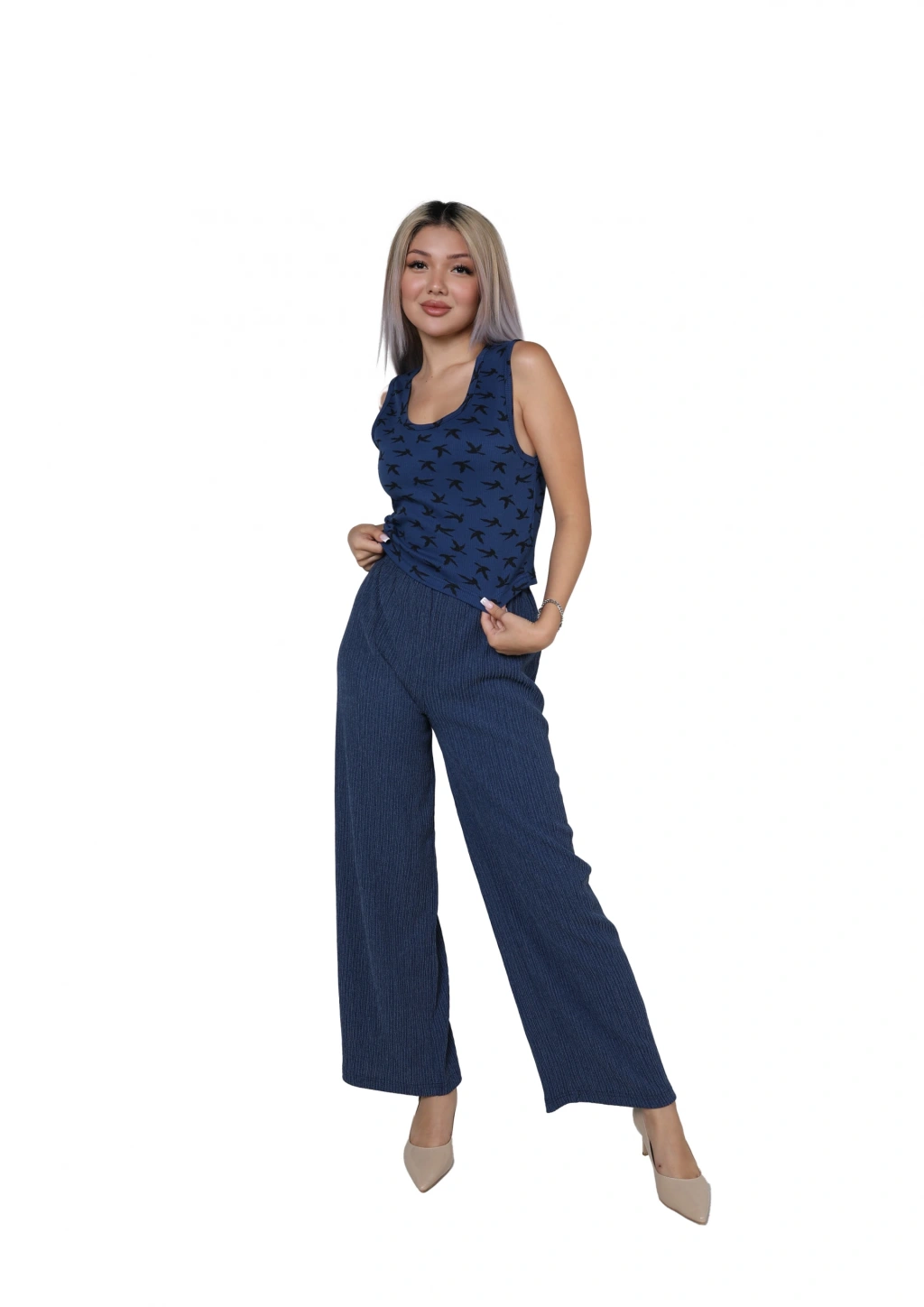 Bu harika takım ile her ortamda dikkatleri üzerinize çekmeye hazır olun. Çamaşır Kenti kalitesi ve şıklığı ile Kadın Kalın Askılı Body Bol Paça Pantolon 2'li Takım Lacivert, şimdi sizi bekliyor!