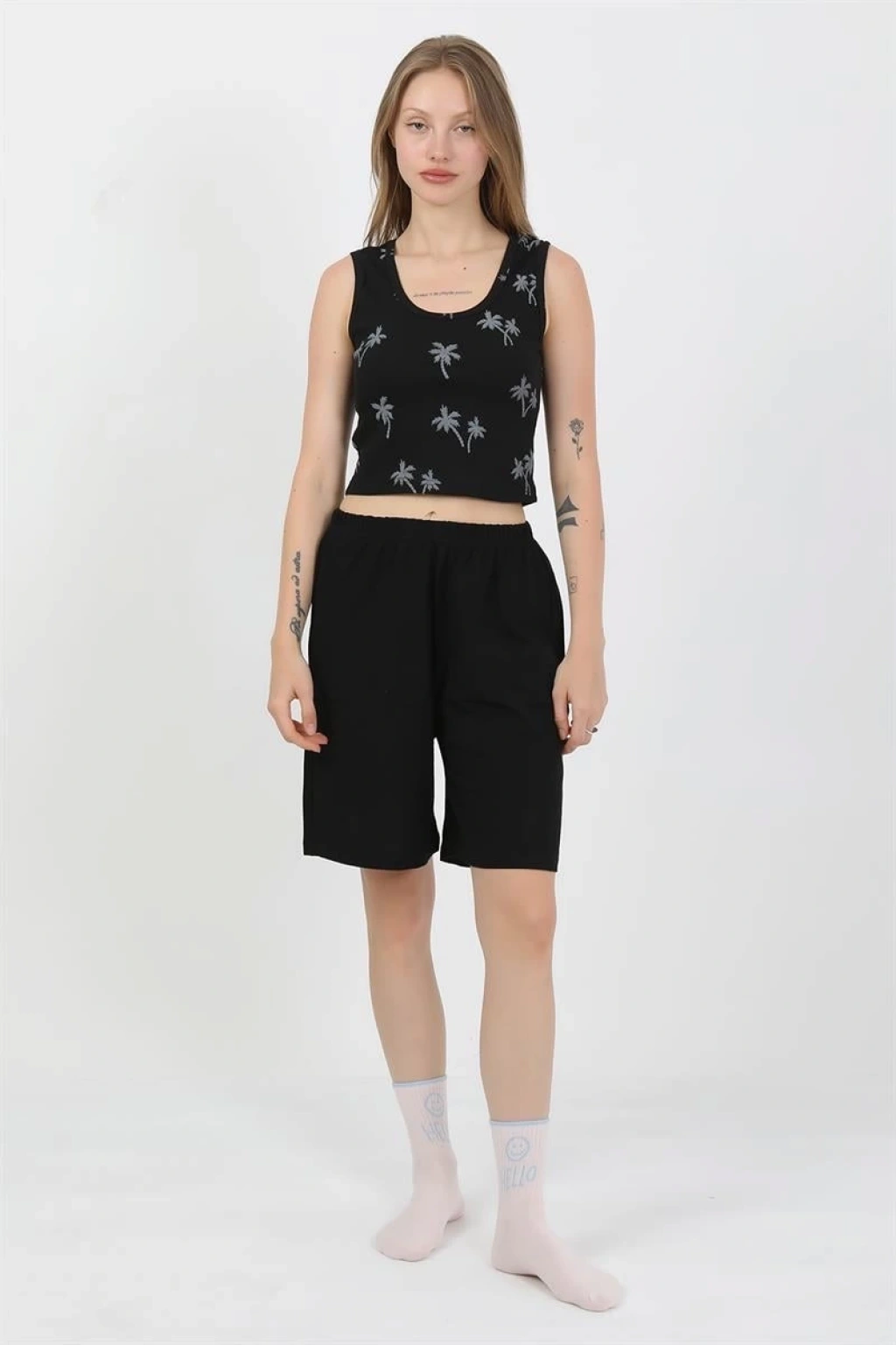 Çamaşır Kenti'nin kadın kalın askılı pamuk penye şortlu crop takımı siyah, tarzınızı ve rahatlığınızı bir arada sunuyor.