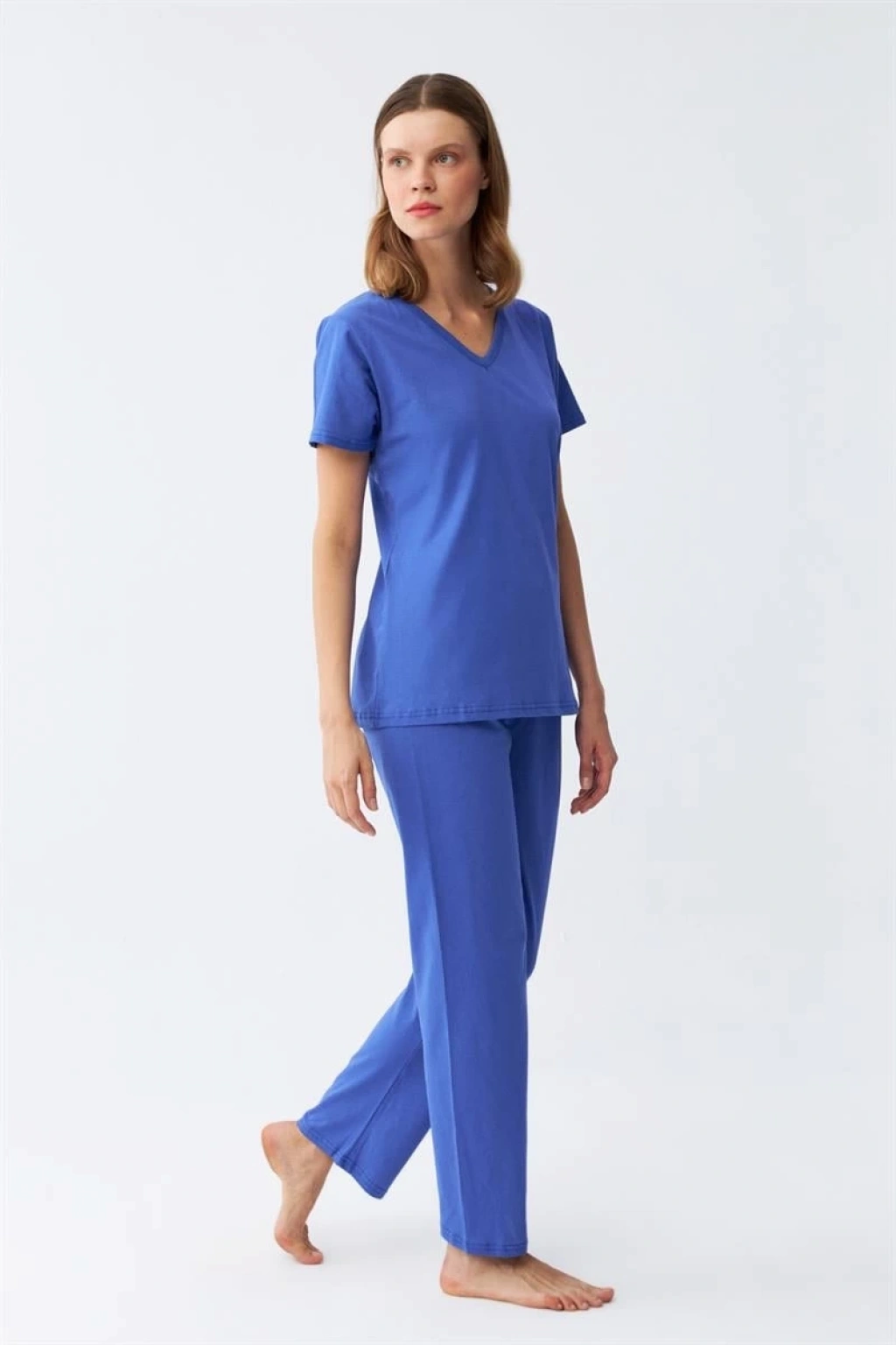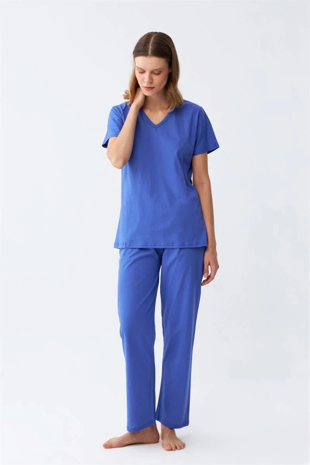 Moda Kadın Kısa Kol Pamuk Penye Pijama Takım Saks