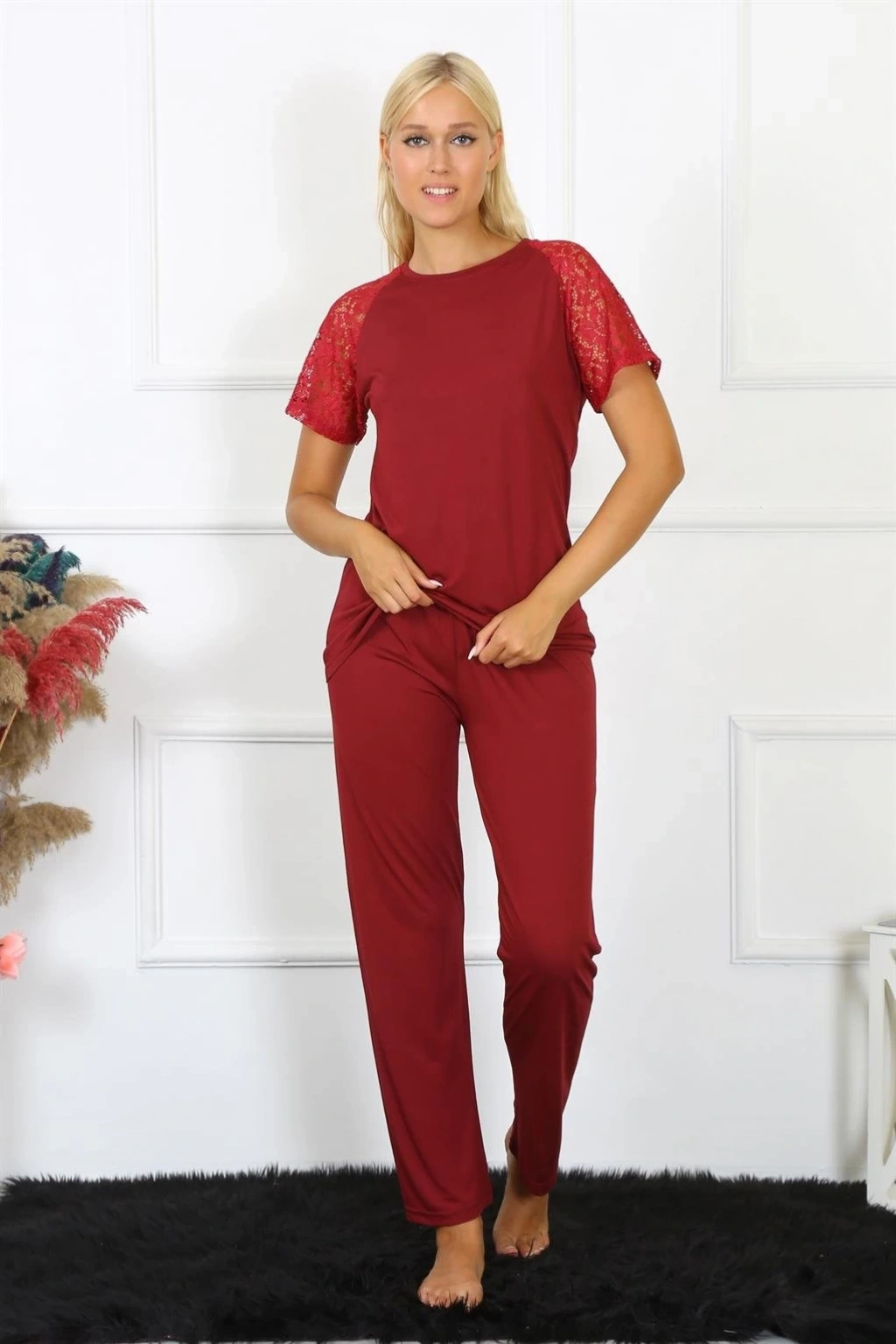Kadın Kolu Dantelli Penye Pijama Takımı Bordo, hem şık görünmek hem de rahat etmek isteyen kadınların tercihi olacak. Siz de bu özel pijama takımı ile gece şıklığınızı tamamlayabilirsiniz!