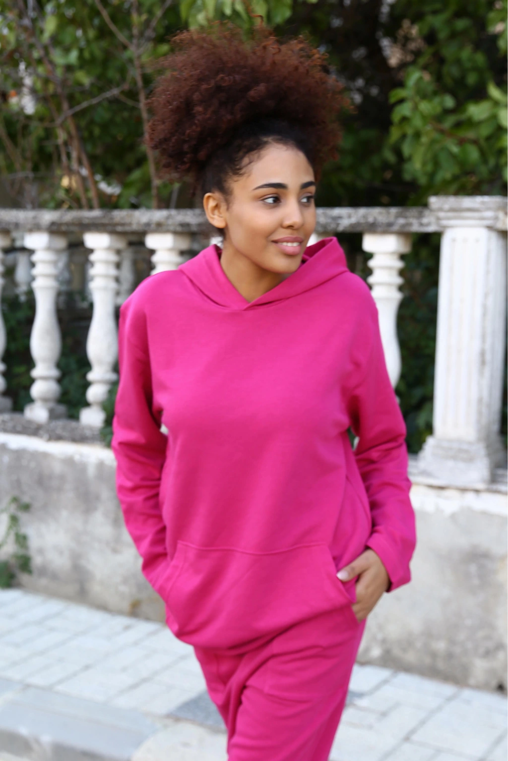 Çamaşır Kenti Kadın Pamuk Kapşonlu Cepli 3 İplik Fuşya Eşofman Takımı, spor salonundan günlük hayata kadar her ortamda şıklığınızı ve rahatlığınızı korumanızı sağlar.