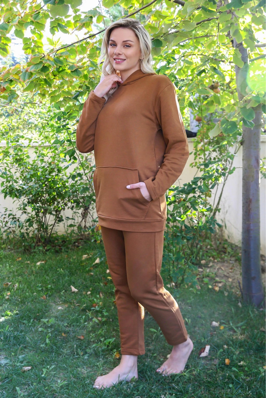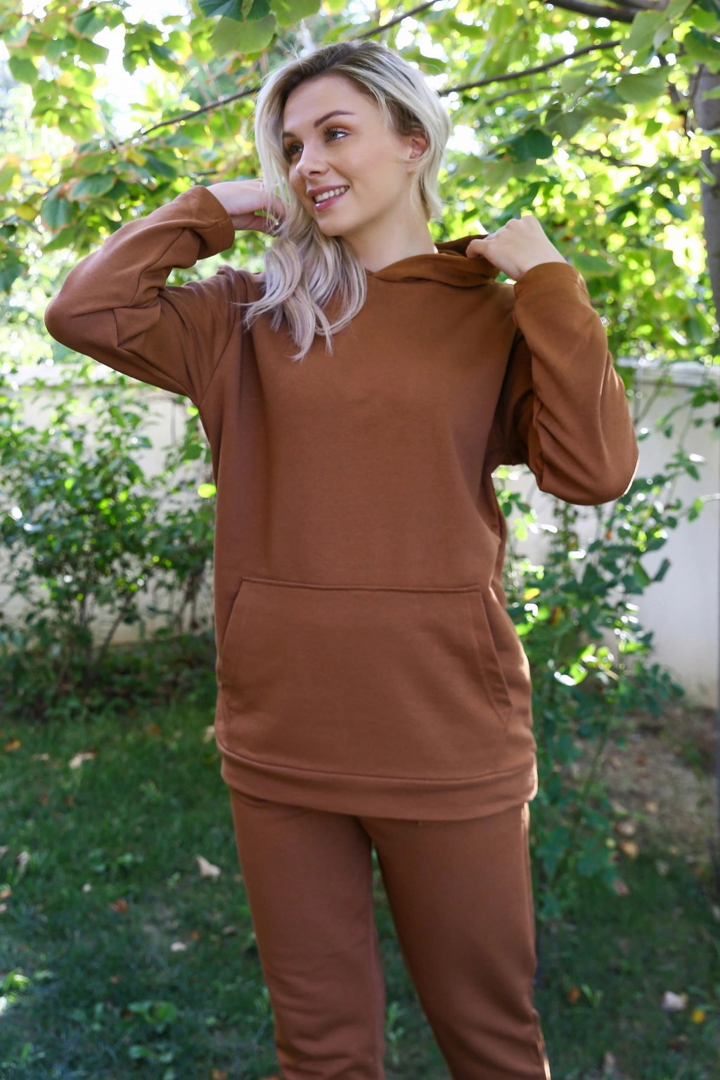 Moda Kadın Pamuk Kapşonlu Cepli 3 İplik Kahve Eşofman Takım