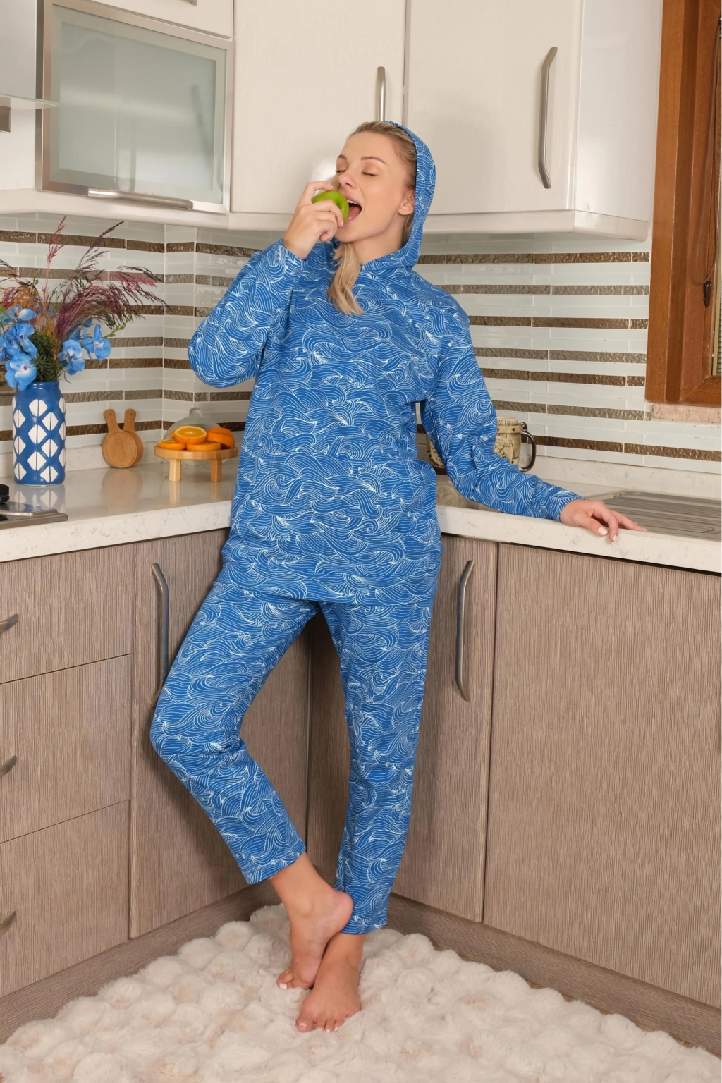 Çamaşır Kenti Kadın Pamuk Kapşonlu Cepli 3 İplik Saks Eşofman Takımı, spor salonundan günlük hayata kadar her ortamda şıklığınızı ve rahatlığınızı korumanızı sağlar.