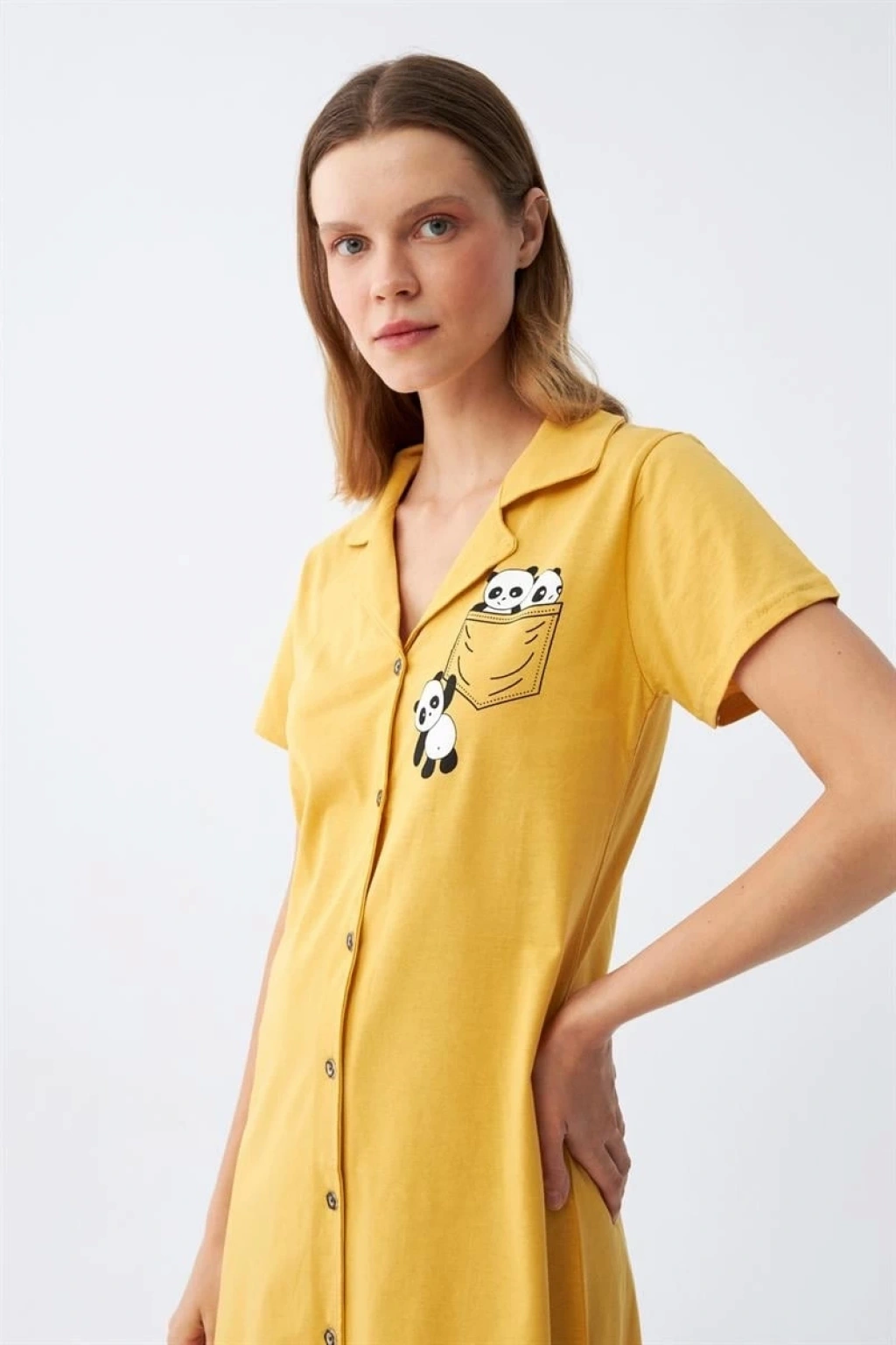 Çamaşır Kenti Kadın Pamuk Penye Kısa Kol Düğmeli Sarı Tunik Gecelik,