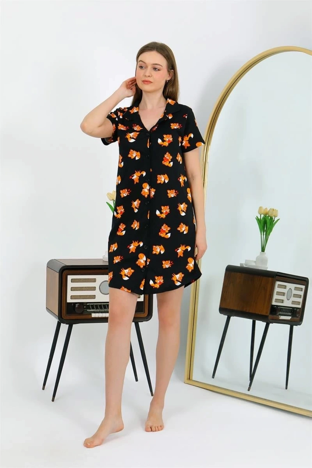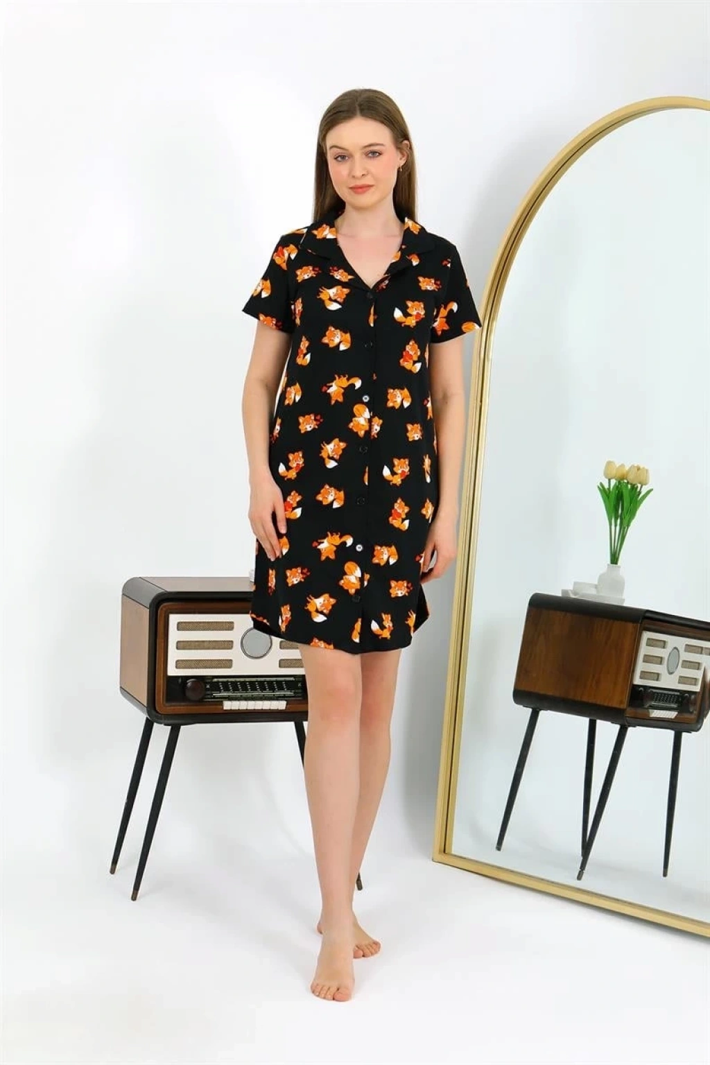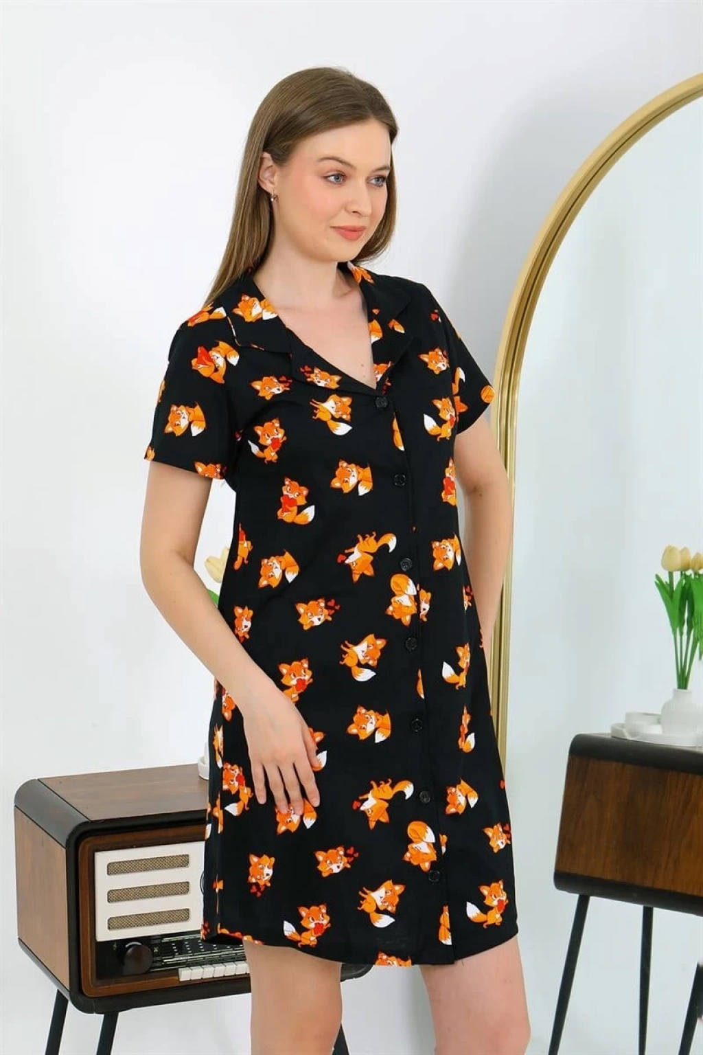Moda Kadın Pamuk Penye Kısa Kol Düğmeli Siyah Tunik Gecelik