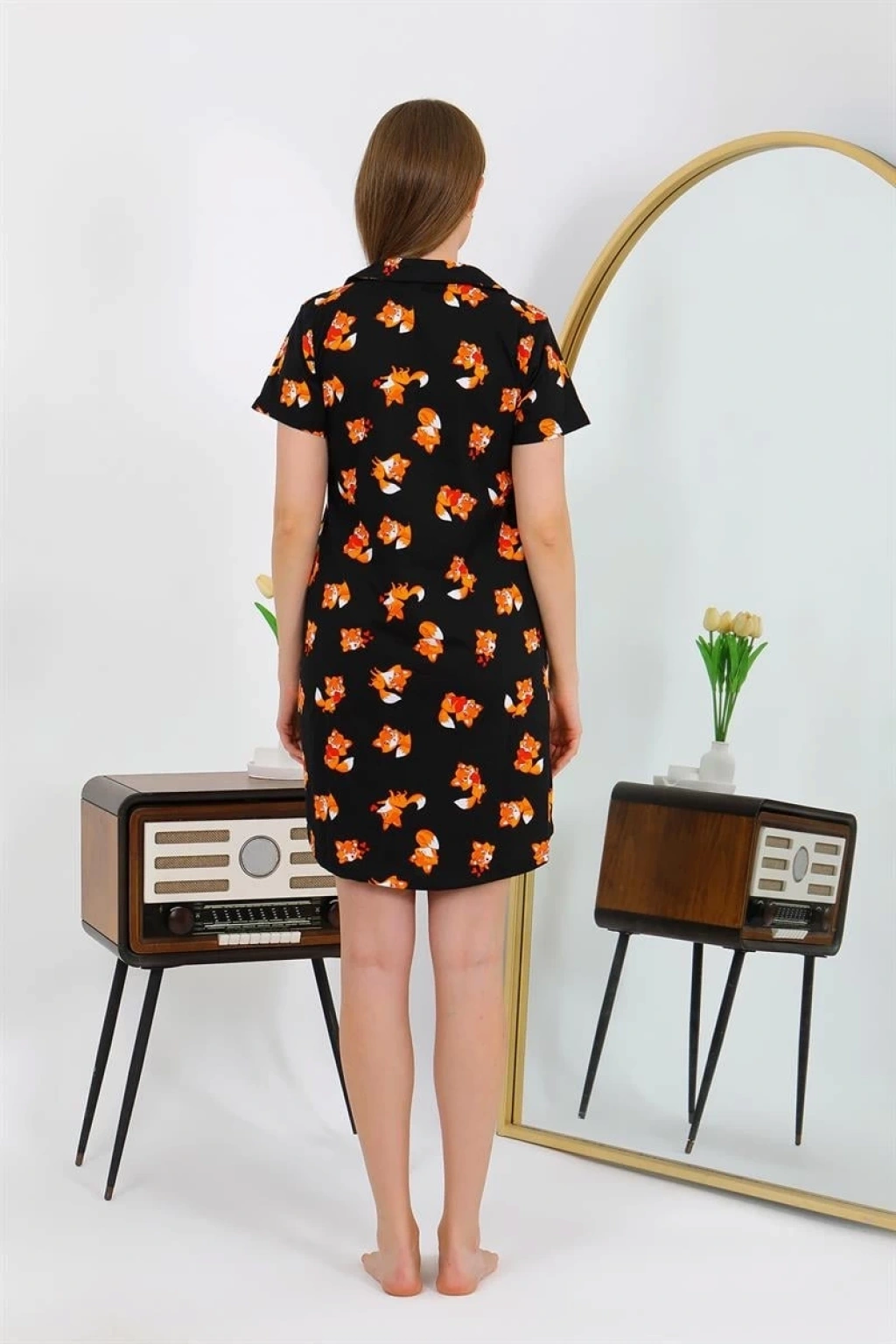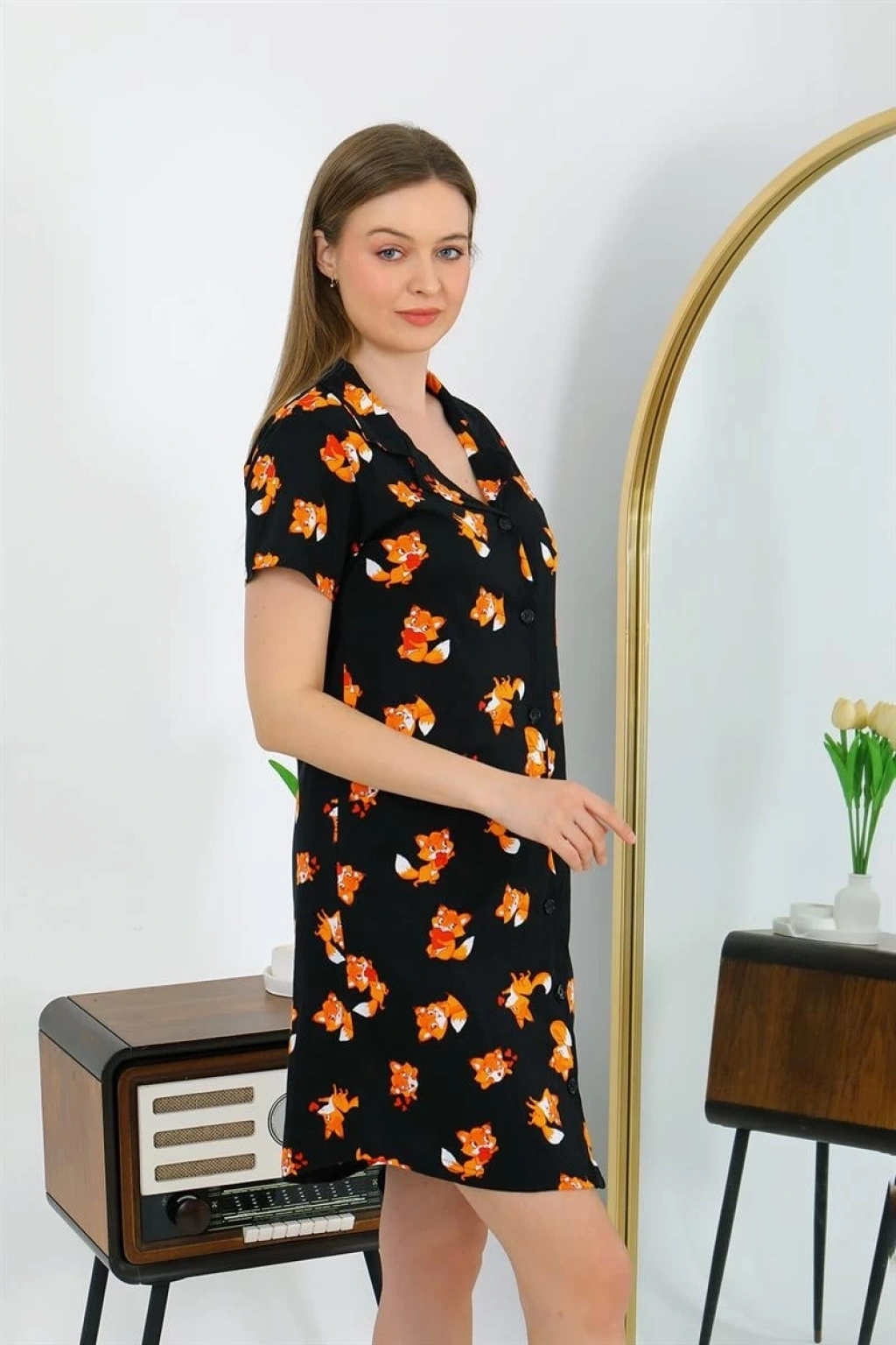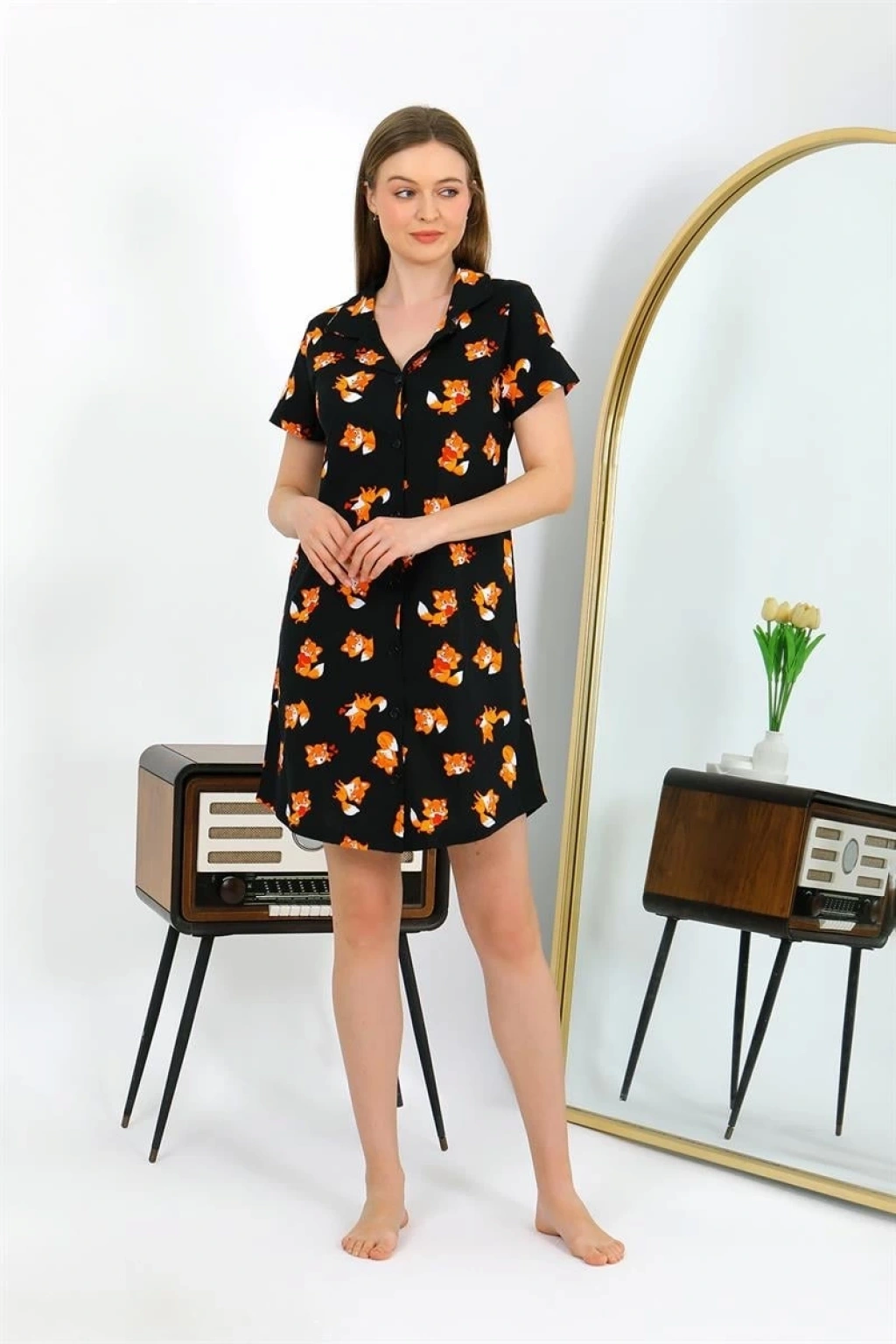 Moda Kadın Pamuk Penye Kısa Kol Düğmeli Siyah Tunik Gecelik