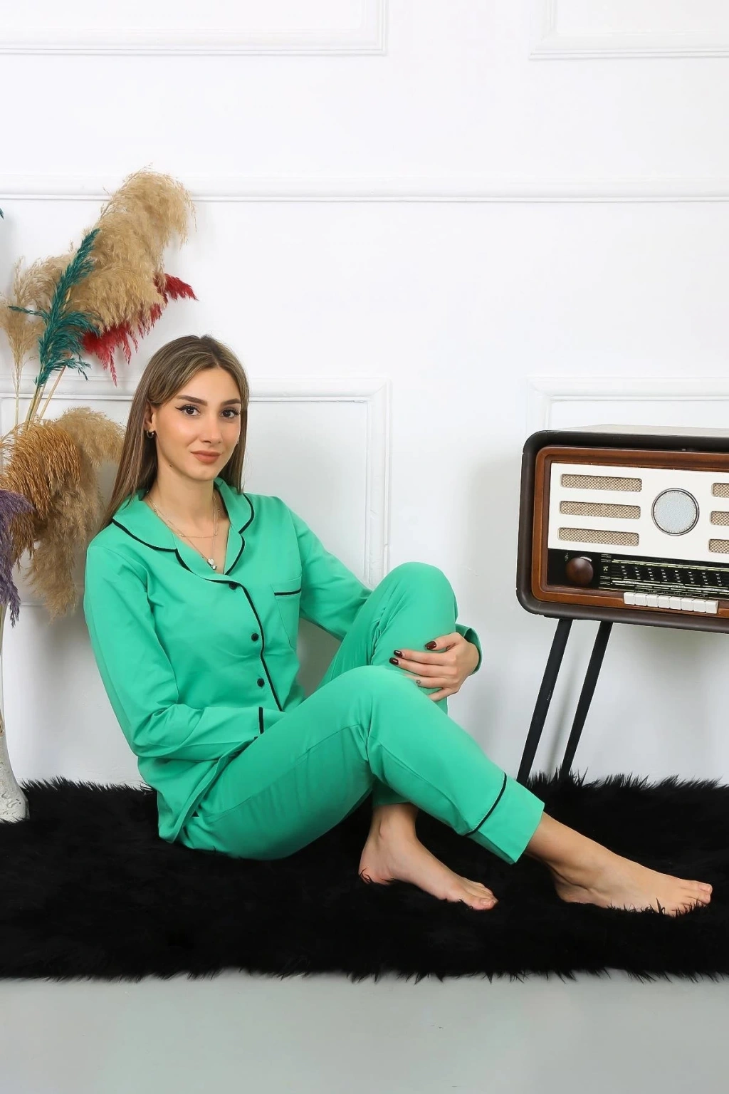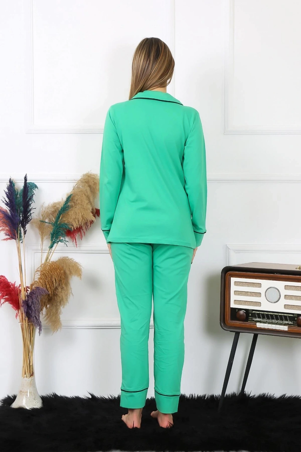Kadın Pamuk Penye Önden Düğmeli Uzun Kol Yeşil Pijama Takım, Çamaşır Kenti kalitesiyle şimdi e-ticaret sitemizde! Rahatlığı ve şıklığı bir arada sunan bu pijama takımı, kullanıcılarına konforlu bir gece uykusu vaat ediyor.