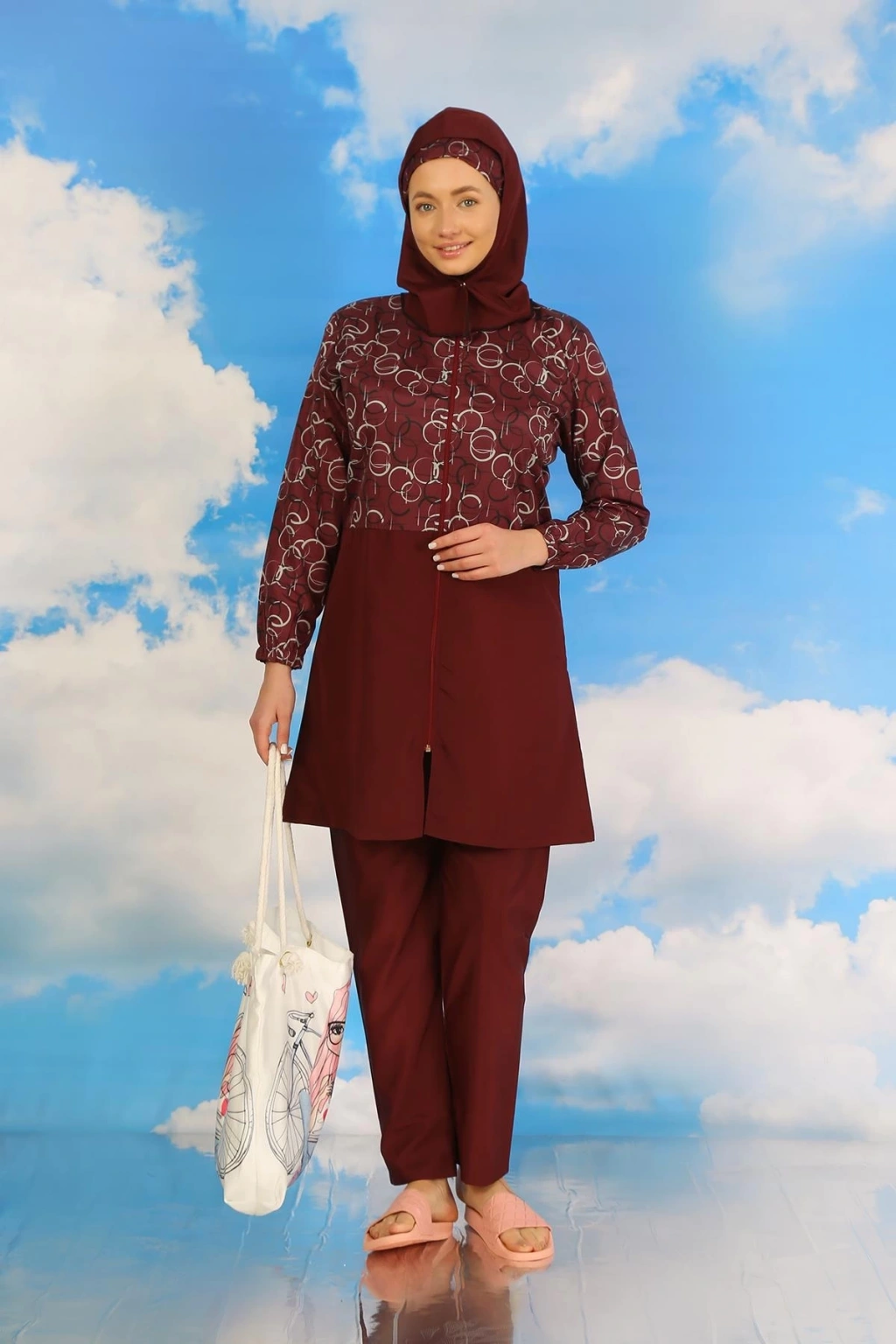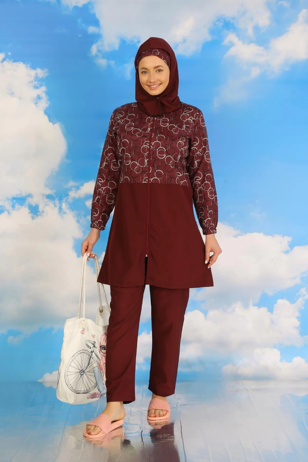 Çamaşır Kenti markasıyla öne çıkan Kadın Pantolonlu Desenli Tam Tesettür Mayo Bordo, plajda rahat ve şık bir görünüm sunar.