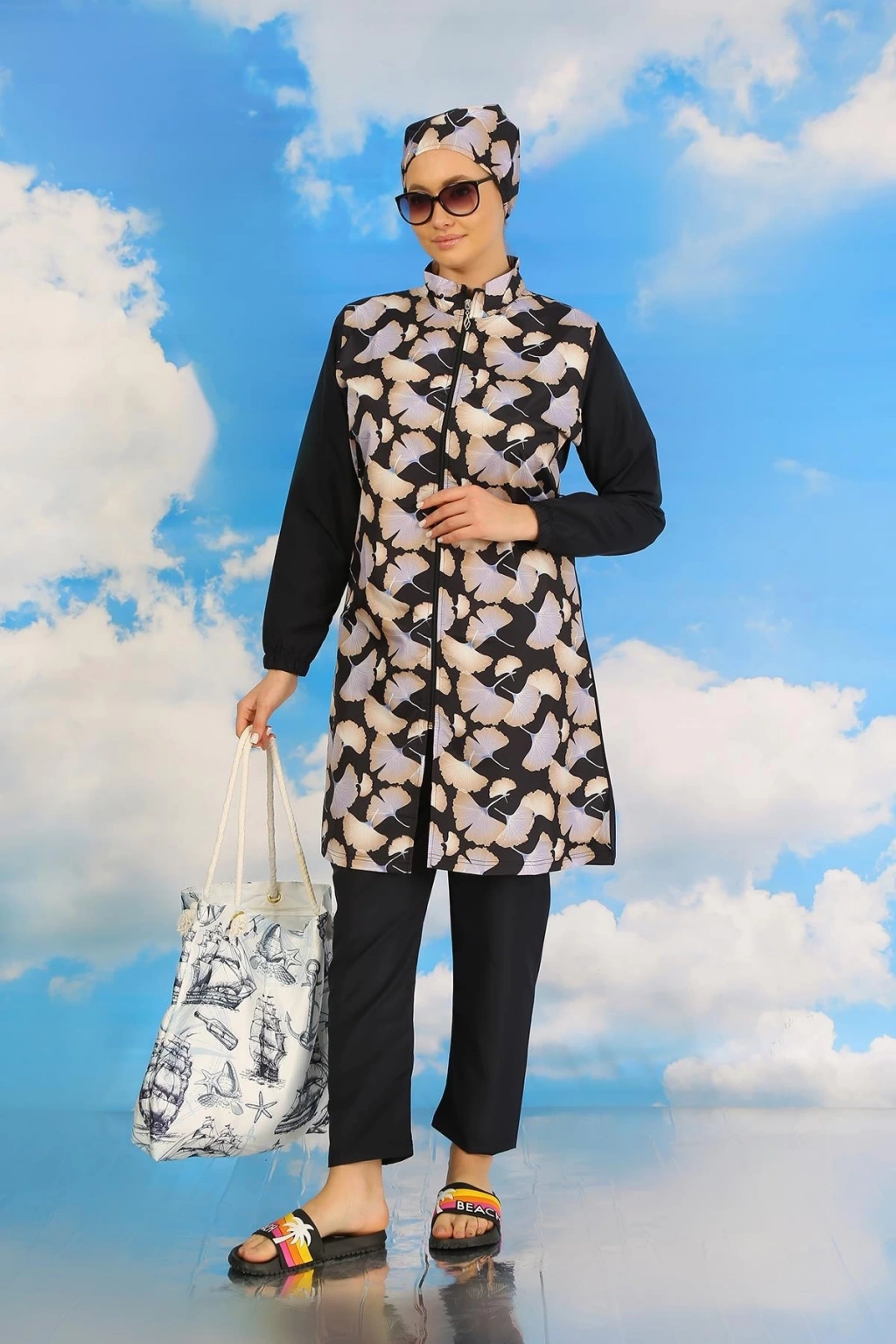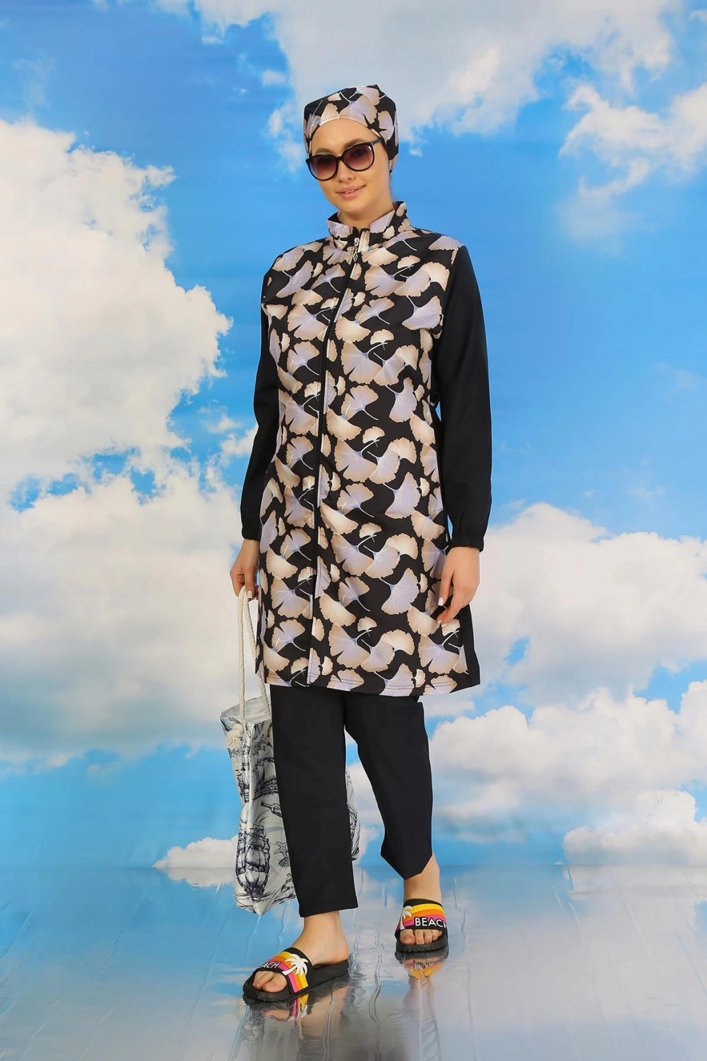 Çamaşır Kenti Kadın Pantolonlu Desenli Tam Tesettür Mayo Lacivert, plajda şıklığı ve rahatlığı bir arada arayan tesettürlü kadınlar için ideal bir seçenektir.