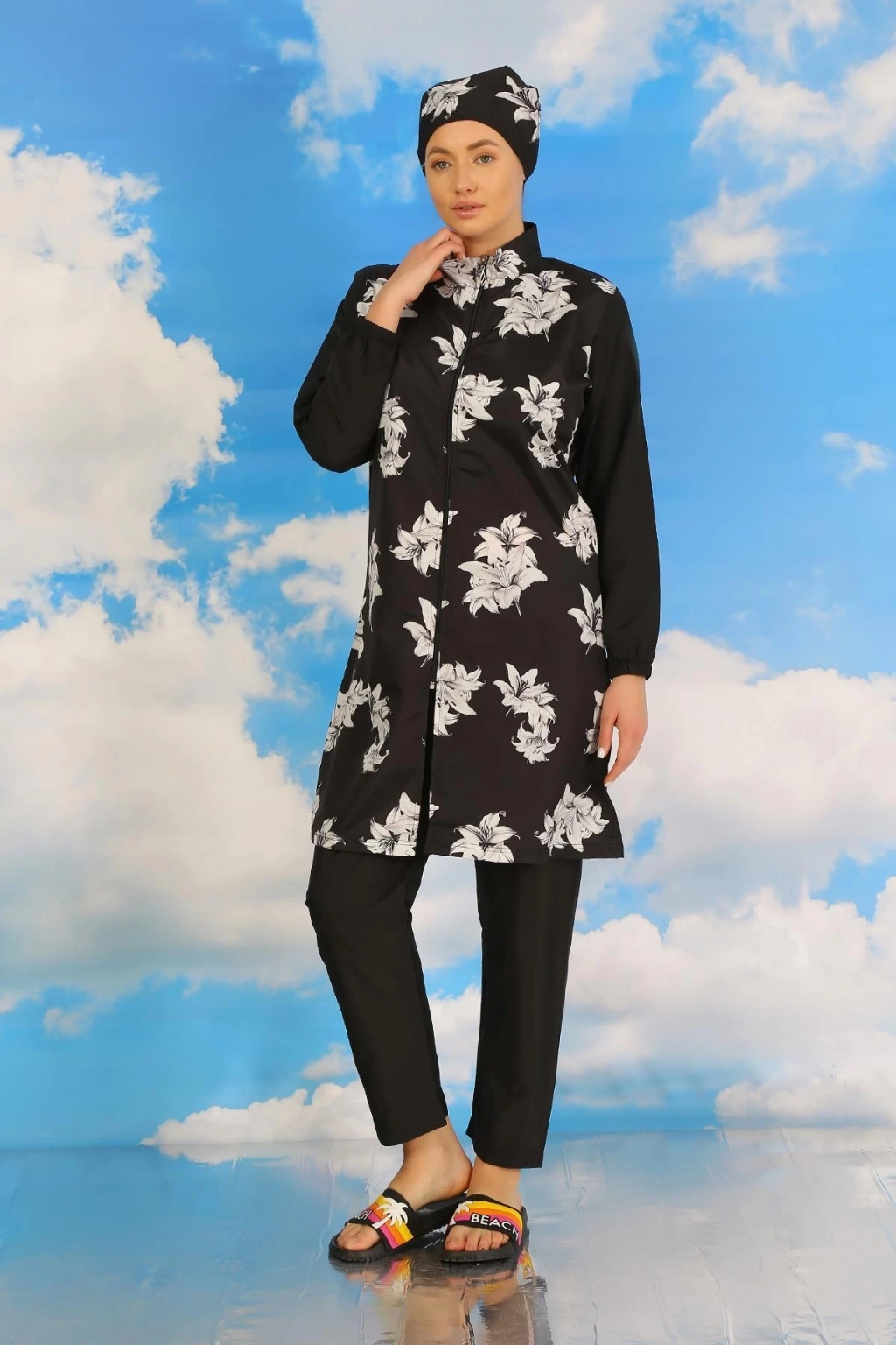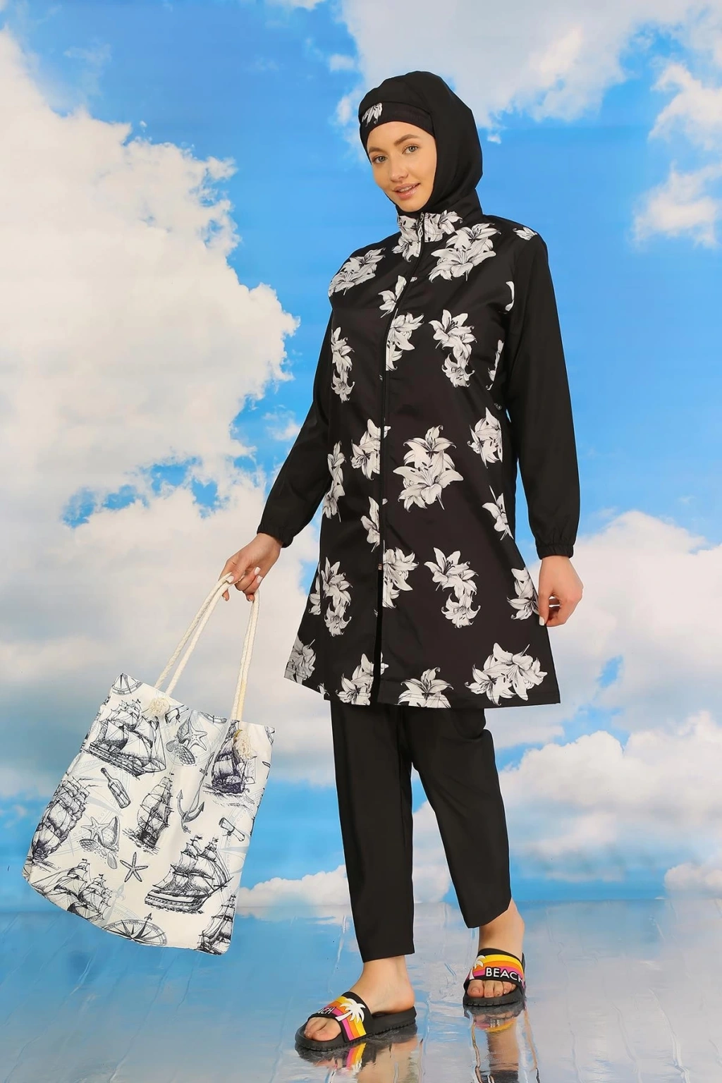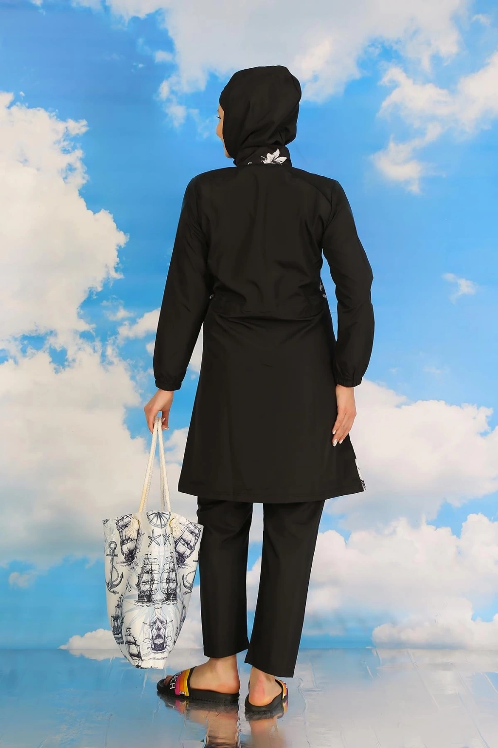 Çamaşır Kenti Kadın Pantolonlu Desenli Tam Tesettür Mayo Siyah, plajda şıklığı ve rahatlığı bir arada arayan tesettürlü kadınlar için ideal bir seçenektir.