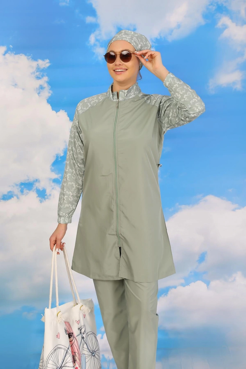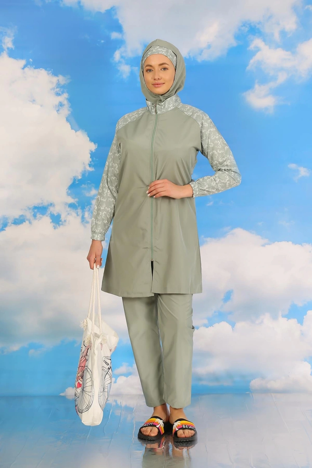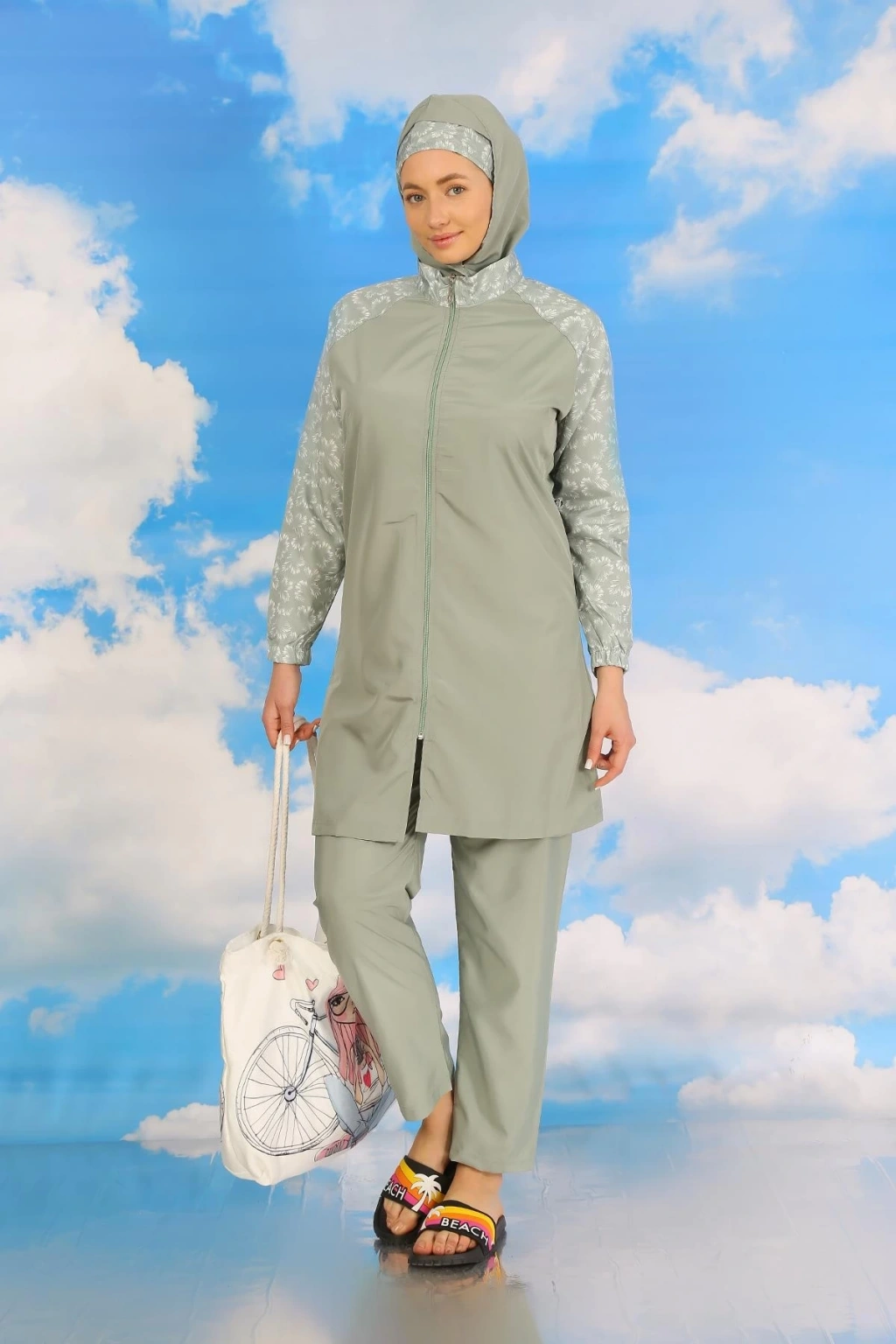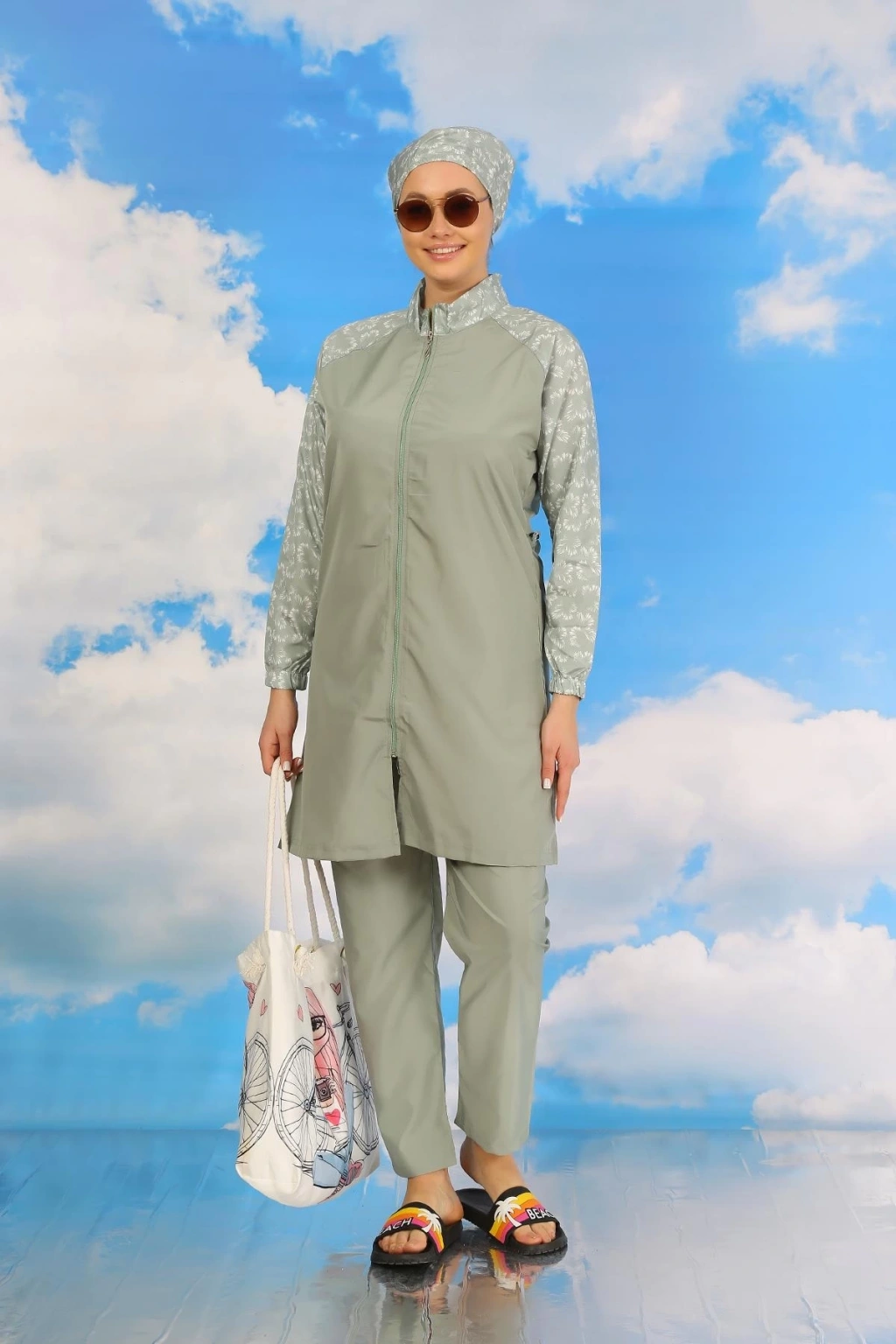 Çamaşır Kenti markasının kalitesi ve şıklığı ile öne çıkan Kadın Pantolonlu Desenli Tam Tesettür Mayo Su Yeşili, plaj giyiminde tarzını konuşturmak isteyen kadınların vazgeçilmezi olmaya aday!