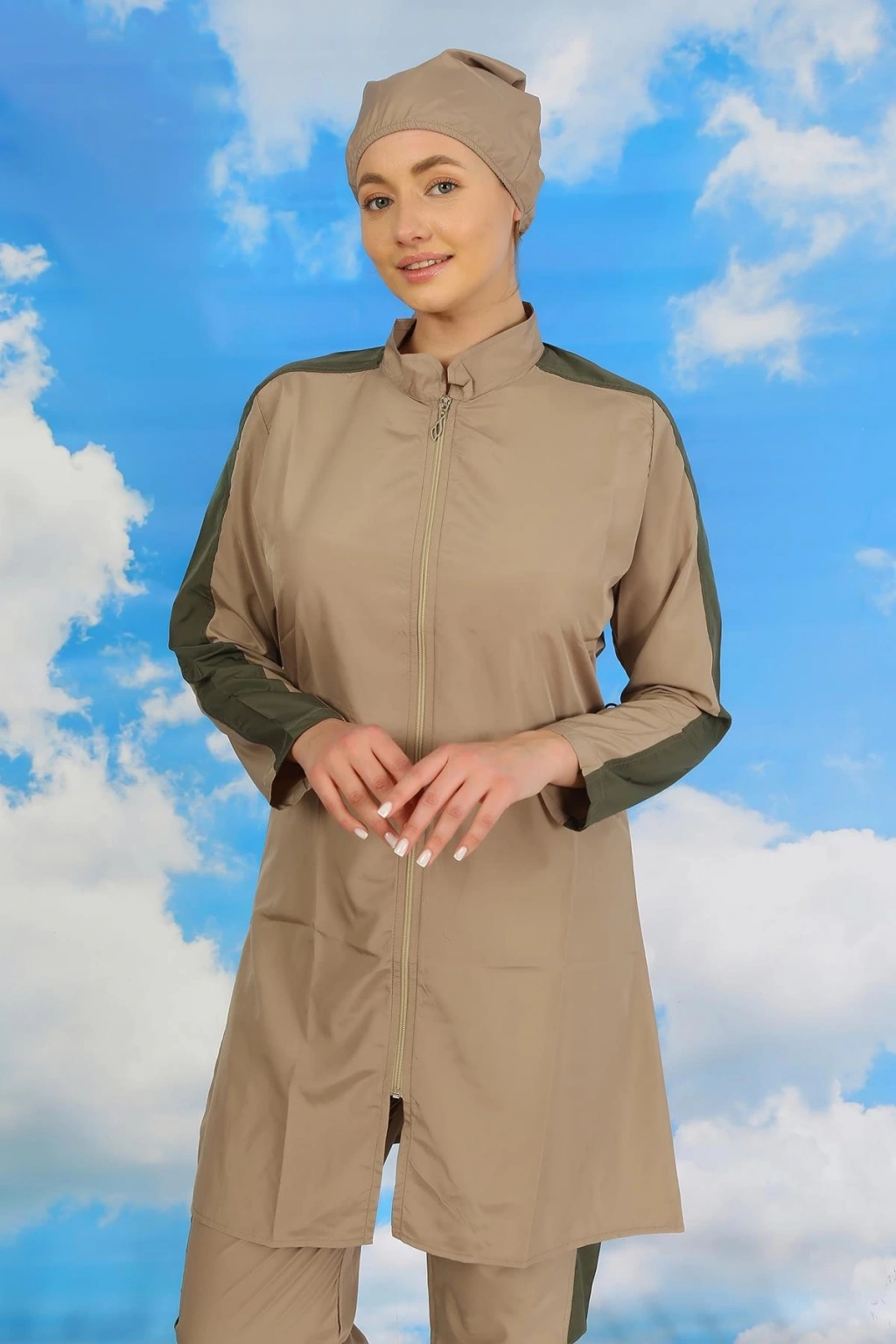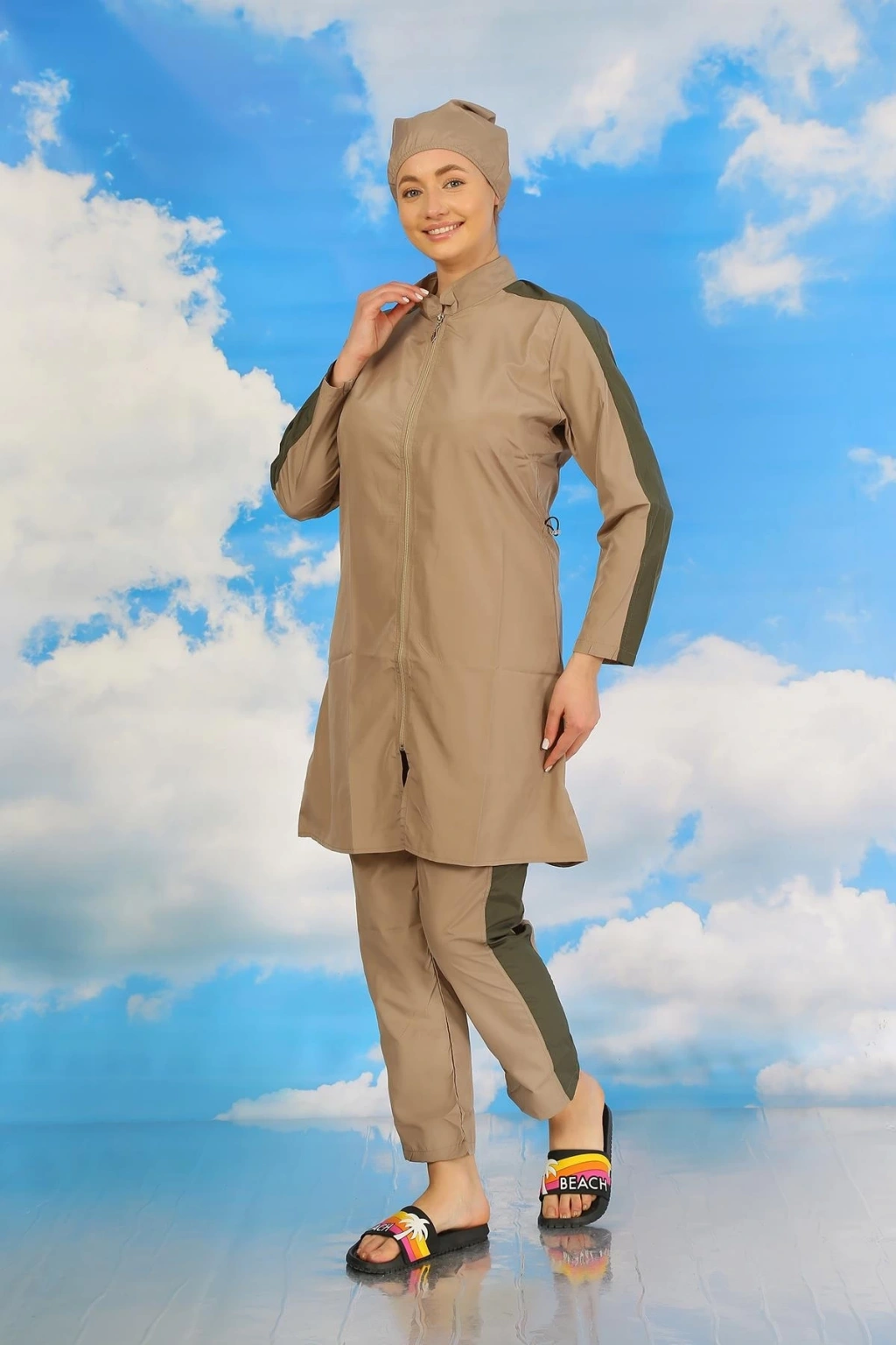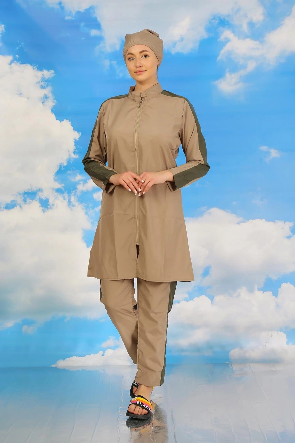 Moda Kadın Pantolonlu Kolu Şeritli Tam Tesettür Mayo Bej