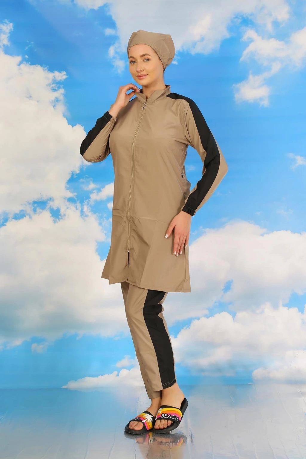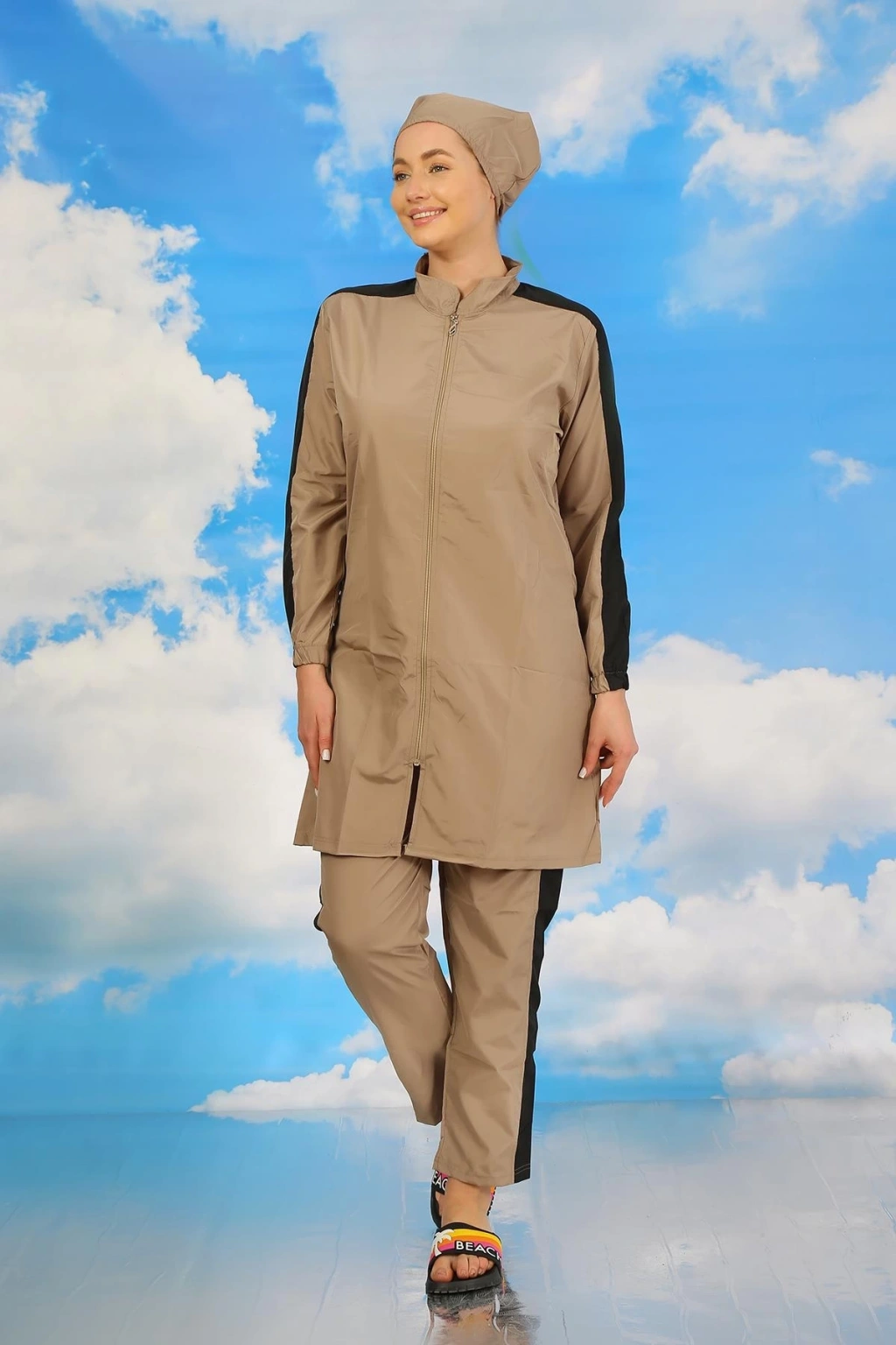 Çamaşır Kenti'nin özel tasarımı olan Kadın Pantolonlu Kolu Şeritli Tam Tesettür Mayo Bej, plaj şıklığınızı tamamlayacak mükemmel bir seçenektir.