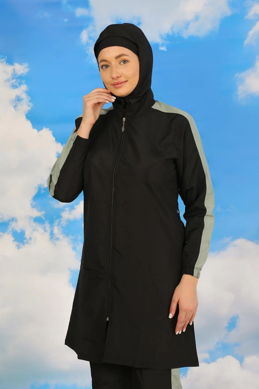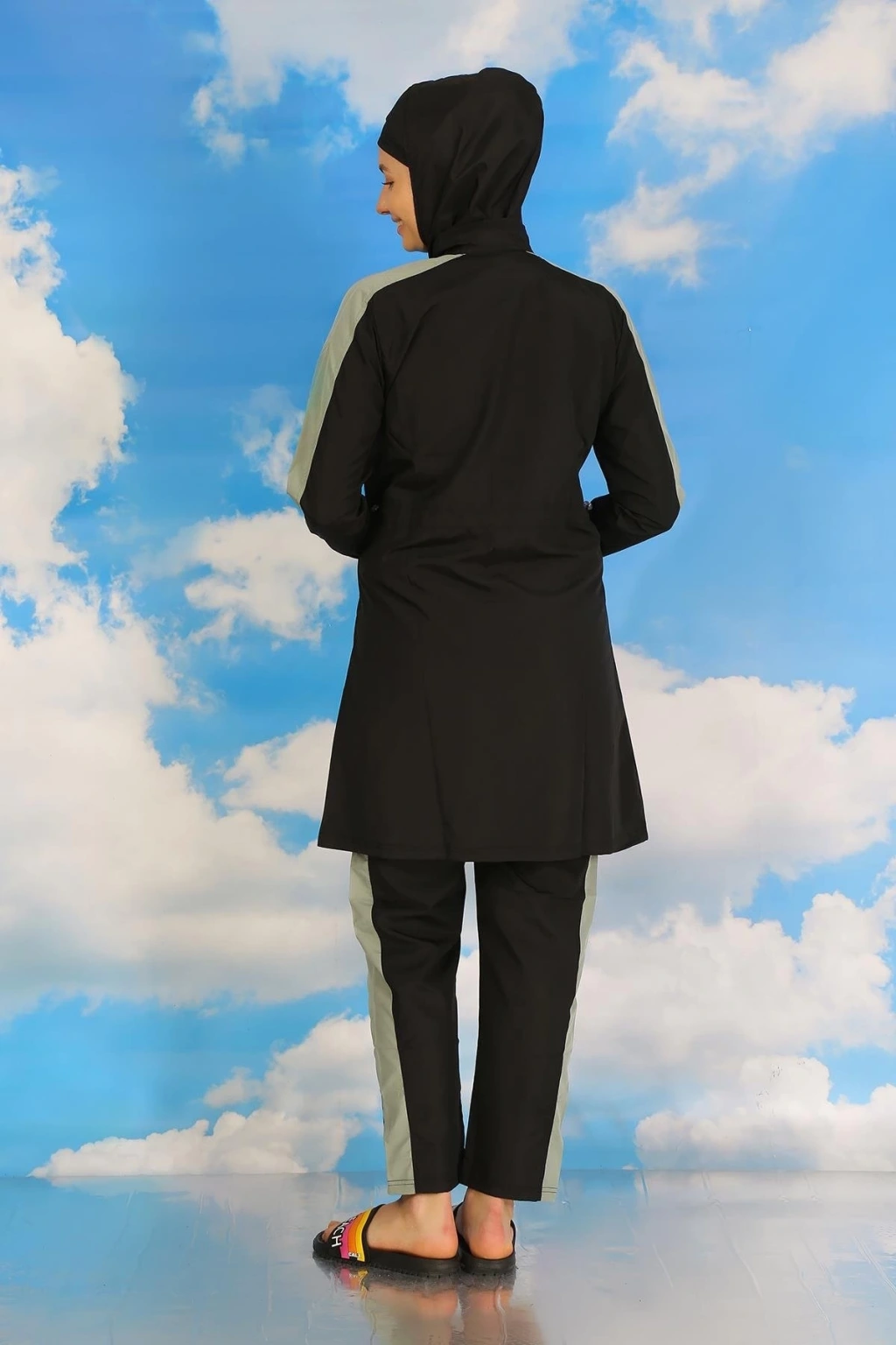 Çamaşır Kenti'nin özel tasarımı olan Kadın Pantolonlu Kolu Şeritli Tam Tesettür Mayo Siyah, plaj şıklığınızı tamamlayacak mükemmel bir seçenektir.