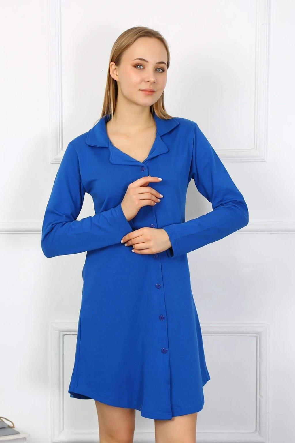 Çamaşır Kenti kadın penye uzun kol düğmeli saks tunik geceliği ile her an rahat ve şık hissedin.