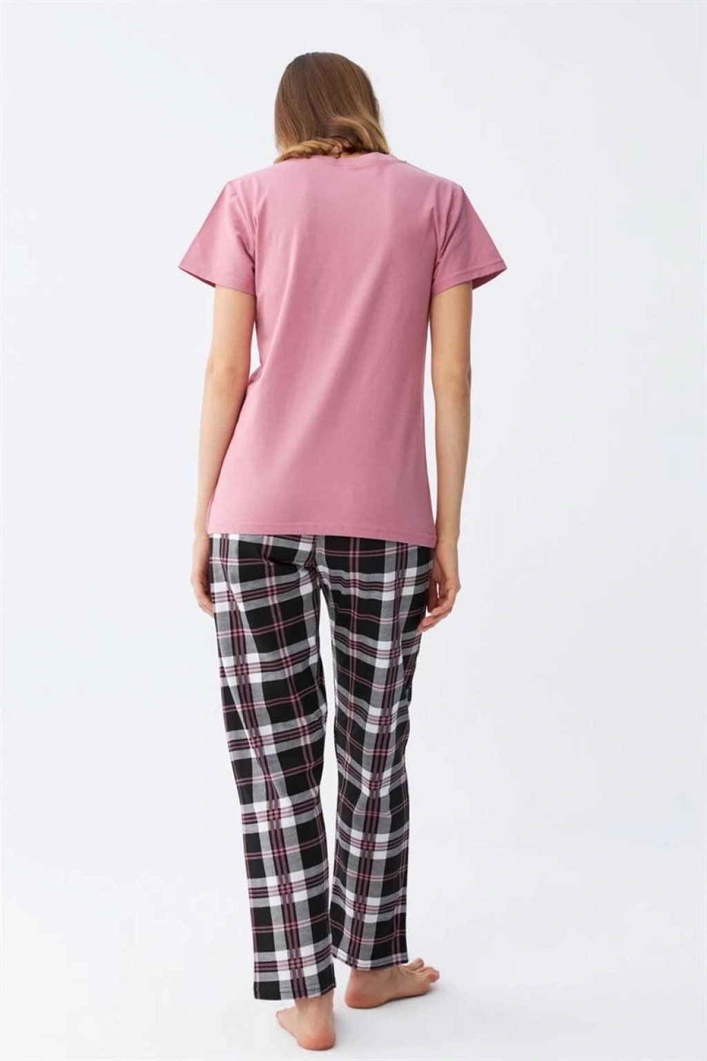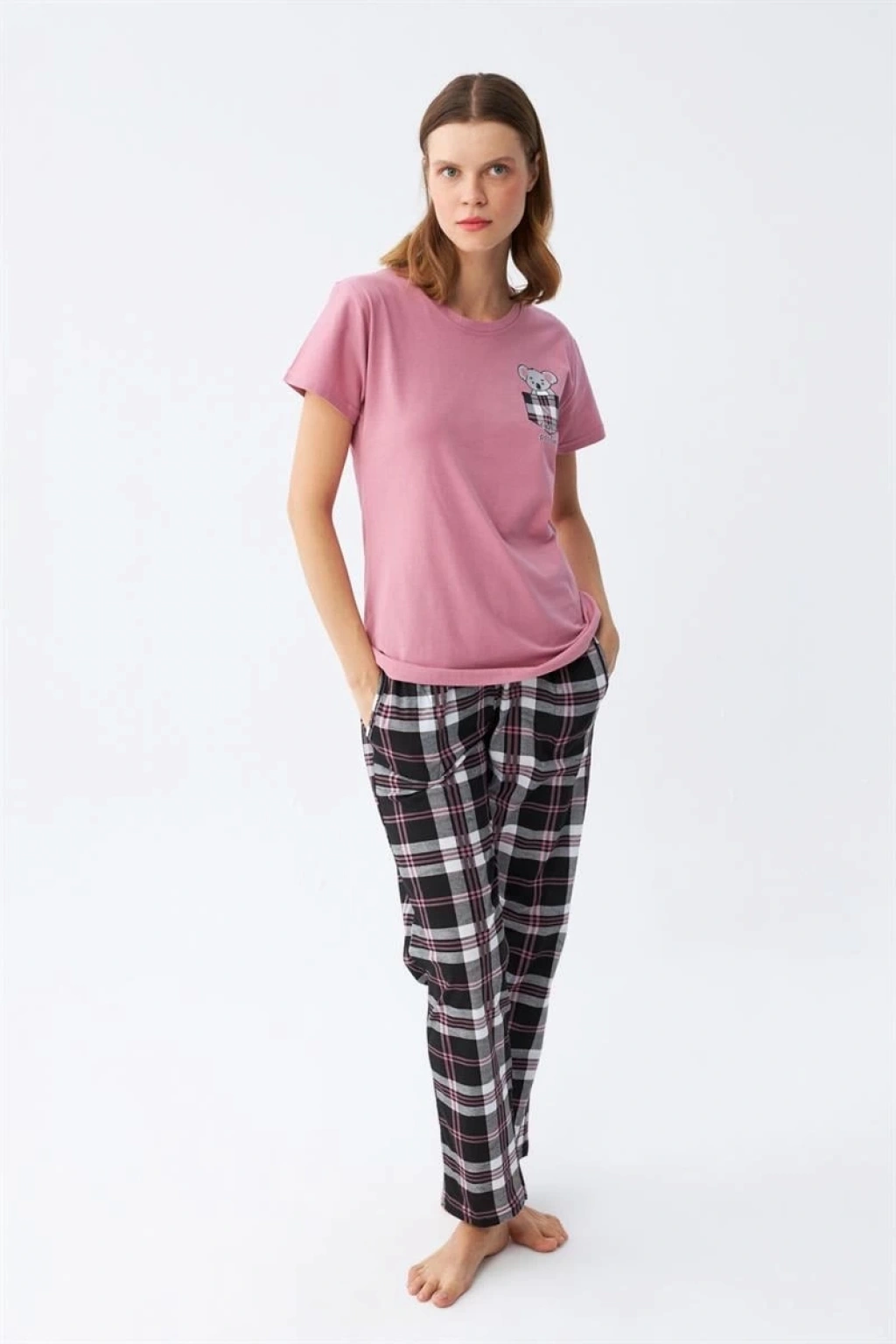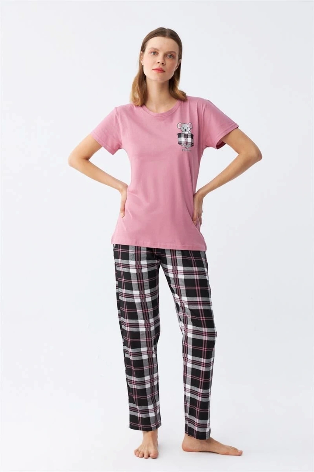 Kadın Somon Ayıcık Baskılı Ekoseli Penye Pijama Takımı, rahatlığı ve şıklığı bir arada sunuyor. Çamaşır Kenti kalitesiyle üretilen pijama takımı, penye kumaşıyla gün boyu konfor sağlar.